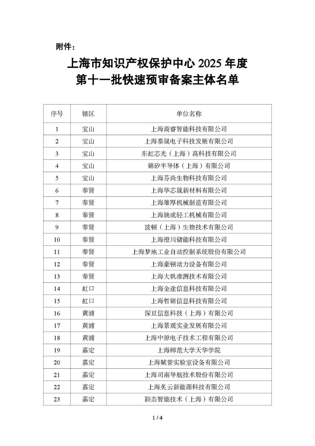 欢迎转载,转载请注明出处,非经授权不得擅改文章内容。为充分发挥预审资源价值,服务本市相关战略性新兴产业创新发展,经创新主体自主申报,上海保护中心审核,国家知识产权局复核,共有104家创新主体通过2025年度第十一批备案申报主体审核,正式成为上海保护中心备案主体。详细名单请见附件。上海保护中心预审备案主体申请持续开放,请符合条件的创新主体通过上海市“一网通办”中的“专利预审服务创新主体备案申请”模块(https://zwdt.sh.gov.cn/govPortals/bsfw/item/6d8f3d86-ebe9-41d4-a928-9e74da0d7371)积极申报。