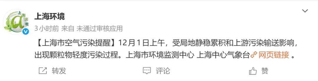 12月1日上午,受局地静稳累积和上游污染输送影响,上海出现颗粒物轻度污染过程。