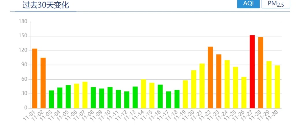2025年11月AQI(空气质量指数)变化。 上海市生态环境局官网 图