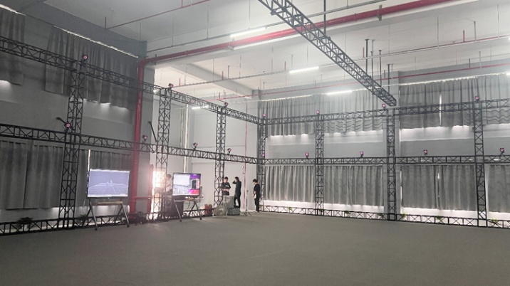 动捕棚内共架设46台Optirack高精度动作捕捉摄像机,总棚共计304平米捕捉空间,使用 8-12 个摄像头,分布在舞台的四周及上方,以便从不同角度捕捉表演者的动作;并配备面部捕捉设备和手指捕捉设备,可以满足超大空间多人表演捕捉、威亚表演捕捉需求。根据现场的层高,为了更好的捕捉效果,设计上下两层捕捉设备。