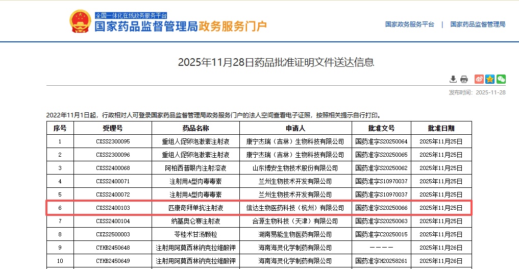 11月28日,信达生物制药集团(香港联交所:01801)宣布,其自主研发的信美悦®(匹康奇拜单抗注射液)已获得国家药品监督管理局(NMPA)批准,用于适合系统治疗的中重度斑块状银屑病成年患者。该药物为银屑病患者带来“快速起效、季度给药、强效维持”的长期管理新选择。