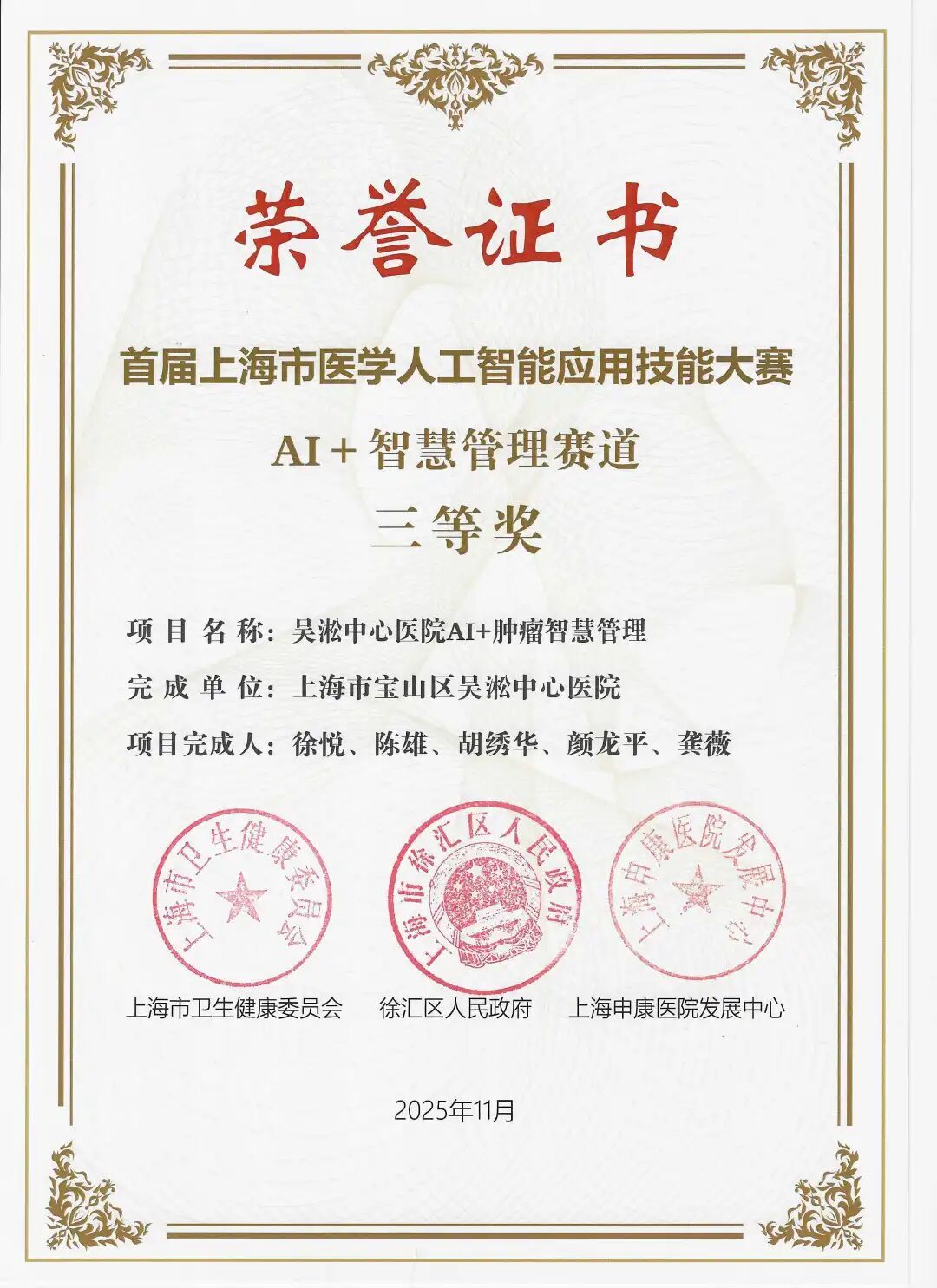 大赛历经初赛、复赛、决赛三阶段层层筛选。自启动以来,共有119个优质项目通过预审,最终31个项目脱颖而出晋级决赛。其中,宝山区吴淞中心医院(复旦大学附属中山医院吴淞医院)申报的《吴淞中心医院AI+肿瘤智慧管理》在AI+智慧服务赛道中荣获三等奖,充分展现了吴医人锐意进取、协同创新的智慧与风采。