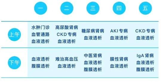 高尿酸肾病专病门诊、CKD专病门诊、糖尿病肾病专病门诊、IgA肾病专病门诊、膜性肾病专病门诊、AKI专病门诊、血管通路专病门诊、血液透析专病门诊、腹膜透析专病门诊、水肿门诊、难治性高血压门诊等12个专病门诊。