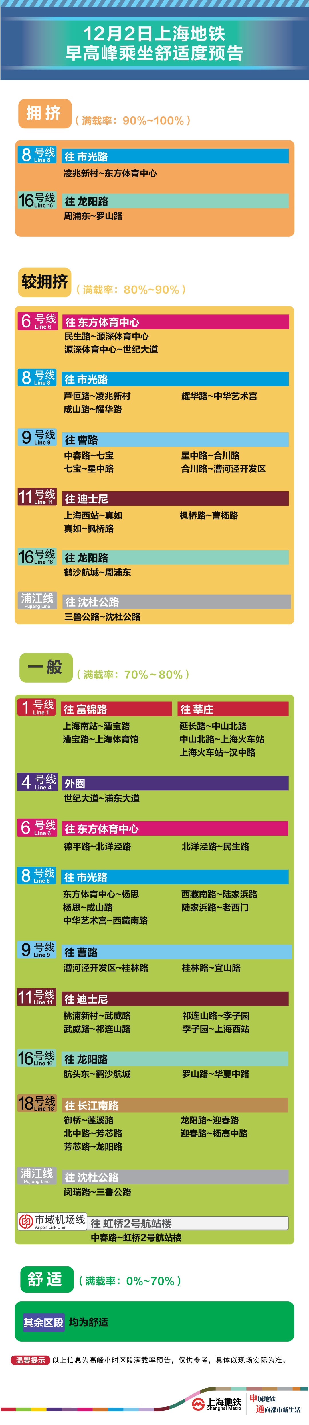 为提升上海地铁早高峰期间出行服务水平,提升乘客乘坐体验,上海地铁向乘客提供乘坐舒适度预告,方便乘客提前做好出行准备。