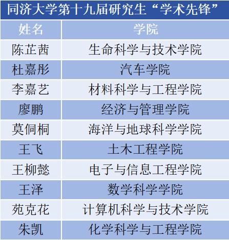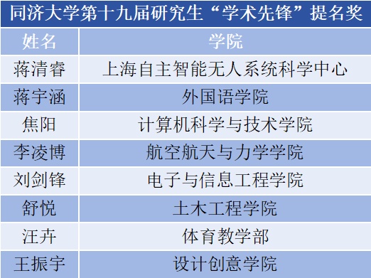 坚持“四个面向” 矢志探索科学奥秘 日前 同济大学 第十九届研究生“学术先锋” 决赛举行 经过激烈角逐 10名学生荣获 同济大学第十九届 研究生“学术先锋”称号 8名学生荣获 同济大学第十九届 研究生“学术先锋”提名奖 祝贺同学们! 01 学术先锋 附:同济大学第十九届研究生“学术先锋”称号 获得者名单(按姓氏首字母排序) 他们是 “学术先锋”风采展示 陈芷茜 格物致知,虽远必至 陈芷茜,生命科学与技术学院2022级博士研究生。研究方向为衰老进程中基因组稳定性的维持机制,并聚焦于长寿动物模型,揭示其独特的DNA修复与基因组稳态调控机制。以第一作者的身份在Science、Life Medicine等杂志发表论文,多次参加国内外学术会议。 杜嘉彤 智能赋能,筑汽车强国梦 杜嘉彤,汽车学院2022级博士研究生。从事人工智能和自动驾驶交叉研究,致力于端到端自动驾驶技术的创新与应用。以第一作者身份发表系列论文专利成果,论文获热点论文、2024年度最佳论文奖。主持的项目获中国国际大学生创新大赛全国银奖。入选中国科协青年人才托举工程博士生专项计划,获博士生国家奖学金、中国汽车工程学会高水平博士论文报告奖等。 李嘉艺 深耕细作,久久为功 李嘉艺,材料科学与工程学院2022级博士研究生。专注于电解水制氢绿色能源材料的设计与应用研究。以第一作者身份在Nature Communications等期刊上发表系列高水平论文,并申请发明专利。多次在国内外学术会议上作口头报告。获同济大学优秀学生干部等荣誉。 廖鹏 在失败中成长,在探索中前行 廖鹏,经济与管理学院2023级博士研究生。研究聚焦医疗管理领域,涵盖医疗供应链优化、城市科学与老年健康等方向,强调以大数据分析、数学建模等多学科方法解决健康与治理中的关键问题。以(共同)第一作者身份在Nature Human Behaviour等期刊上发表论文。获博士研究生国家奖学金等荣誉。 莫侗桐 深海没有极限,助力能源强国 莫侗桐,海洋与地球科学学院2023级博士研究生。主要从事基于“压缩感知+深度学习”框架的智能化勘探地震数据处理与反演研究工作。主持国家自然科学基金青年学生基础研究项目(博士研究生),以第一作者身份发表高水平论文成果,授权国家发明专利。担任国际期刊审稿人,连续两年获中国地球科学联合学术年会优秀学生论文奖等。 王飞 请直面挑战,因为它们不招自来 却会因你的勇气而烟消云散 王飞,土木工程学院2022级博士研究生。主要从事低纤维掺量低碳ECC材料设计与应用研究。以第一作者或通讯作者发表系列学术论文成果。获得同济大学优秀博士新生奖学金、同济大学苏州育才奖学金、博士研究生国家奖学金等荣誉,入选中国科协青年人才托举工程博士生专项计划。 王柳懿 信驭经纬,算法为锋 极目星程,智领未来 王柳懿,电子与信息工程学院2022级博士研究生。主要从事具身智能及视觉-语言导航研究。主持国家自然科学基金青年学生基础研究项目(博士研究生),入选中国科协青年人才托举工程博士生专项计划。获同济大学“追求卓越”学生奖、宝钢优秀大学生奖学金等,获中国智能自动化大会最佳论文奖。发表系列论文成果,授权与公开专利多项。 王泽 学海无涯,勇攀高峰 且行且惜,渡人渡己 王泽,数学科学学院2020级博士研究生。主要研究大规模带约束不适定线性反问题的高效数值迭代方法及其理论基础。发表高水平论文成果,获得日本工业与应用数学学会第72届年会最优发表奖(首位获奖的中国留学生)、博士研究生国家奖学金、中国国际大学生创新大赛上海赛区银奖等荣誉。 苑克花 于起步维艰处沉淀初心 在科研孤寂中铸就星光 苑克花,计算机科学与技术学院2022级博士研究生。聚焦不确定性人工智能与大数据分析相关课题,在人工智能领域权威期刊发表系列论文成果。入选中国科协青年人才托举工程博士生专项计划,主持国家自然科学基金青年学生基础研究项目(博士研究生),多次在学术会议上作报告,担任期刊审稿人。获博士研究生国家奖学金、硕士研究生国家奖学金等荣誉。 朱凯 凡心所向,素履以往 生如逆旅,一苇以航 朱凯,化学科学与工程学院2023级博士研究生。聚焦功能化氢键有机框架复合材料,围绕多重刺激光响应智能传感器件及仿生识别监测展开研究。作为核心技术骨干参与两项国家自然科学基金面上项目。已发表系列高水平论文成果。获博士研究生国家奖学金、硕士研究生国家奖学金、同济大学8236化学创新奖学金等荣誉。 02 学术先锋提名奖 附:同济大学第十九届研究生“学术先锋”提名奖 获得者名单(按姓氏首字母排序) 他们是 “学术先锋”提名奖风采展示 蒋清睿 让科学更有温度,让城市更具智慧 蒋清睿,上海自主智能无人系统科学中心2023级博士研究生。致力于人工智能与城市科学交叉的研究,让城市规律可量化、可解释。 蒋宇涵 学以致用,点亮星途 蒋宇涵,外国语学院2023级博士研究生。致力于孤独症儿童语用交流能力方面的研究。 焦阳 跃脱局部,收敛至真 焦阳,计算机科学与技术学院2020级博士研究生。主要研究方向为Network+AI、分布式机器学习、多层优化。 李凌博 力学铸基,科研追光 心向国之重器,志赴学术前沿 李凌博,航空航天与力学学院2022级博士研究生。致力于轻量化多功能材料与结构的设计与应用研究。 刘剑锋 以真知为