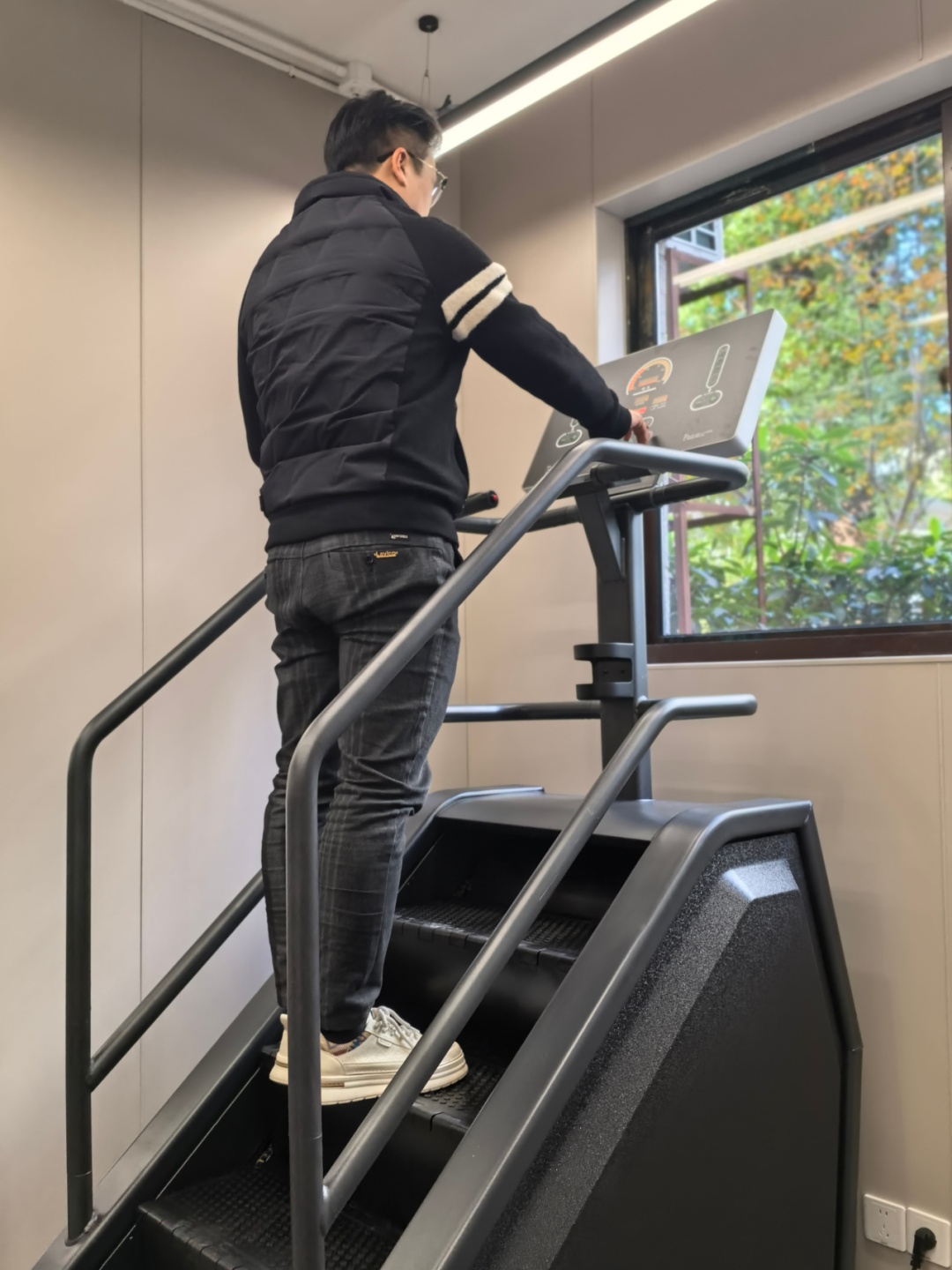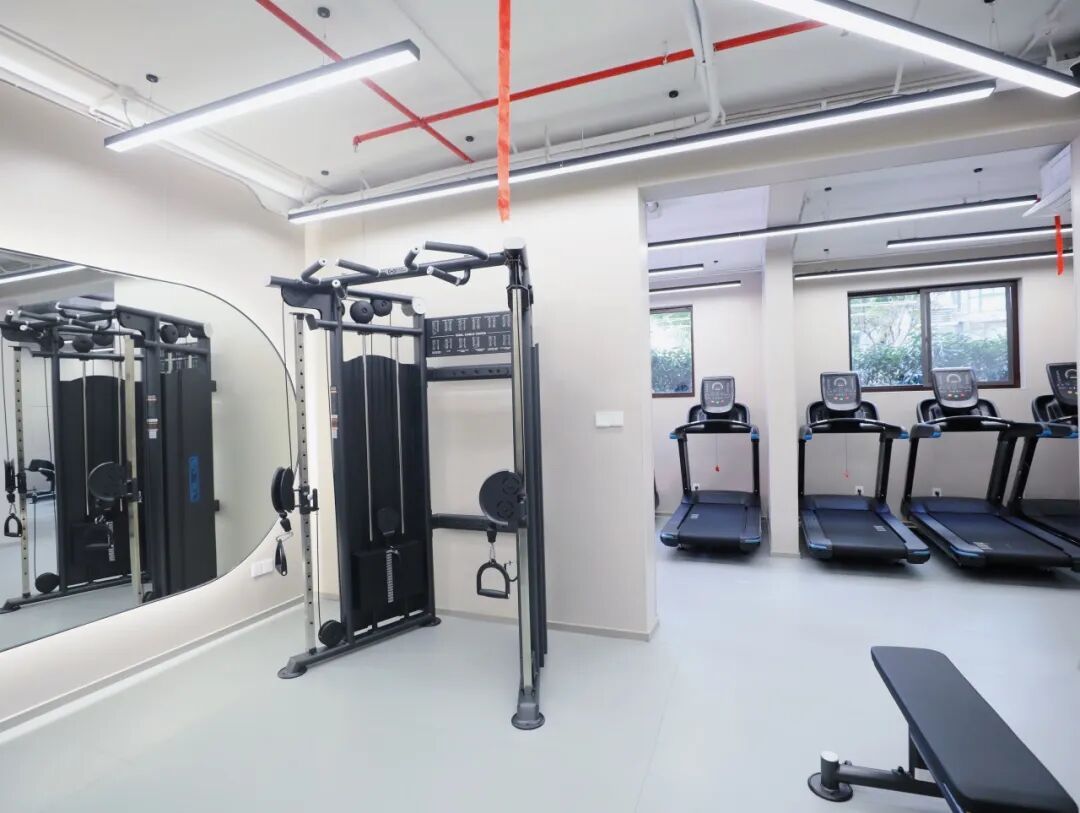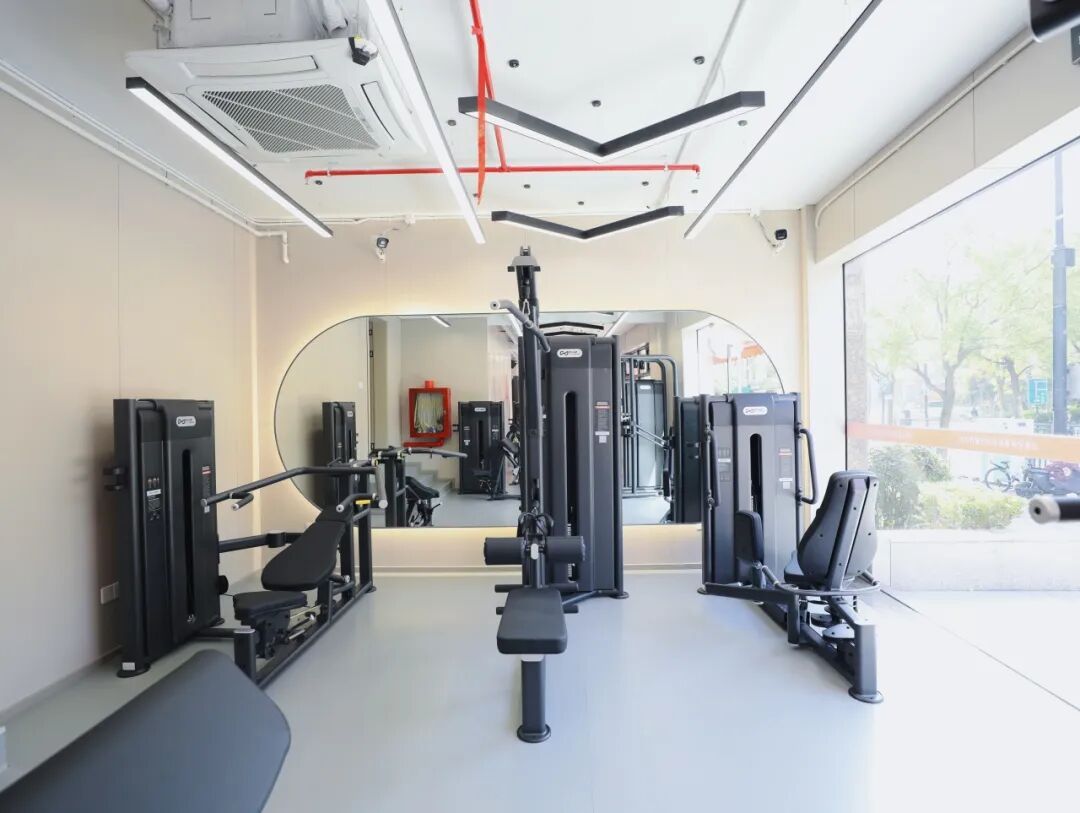 一层的智慧共享健身区,设有更衣柜可供寄存随身物品,配备6台跑步机、1台爬楼机,以及诸多固定力量器械,可进行有氧和无氧运动。