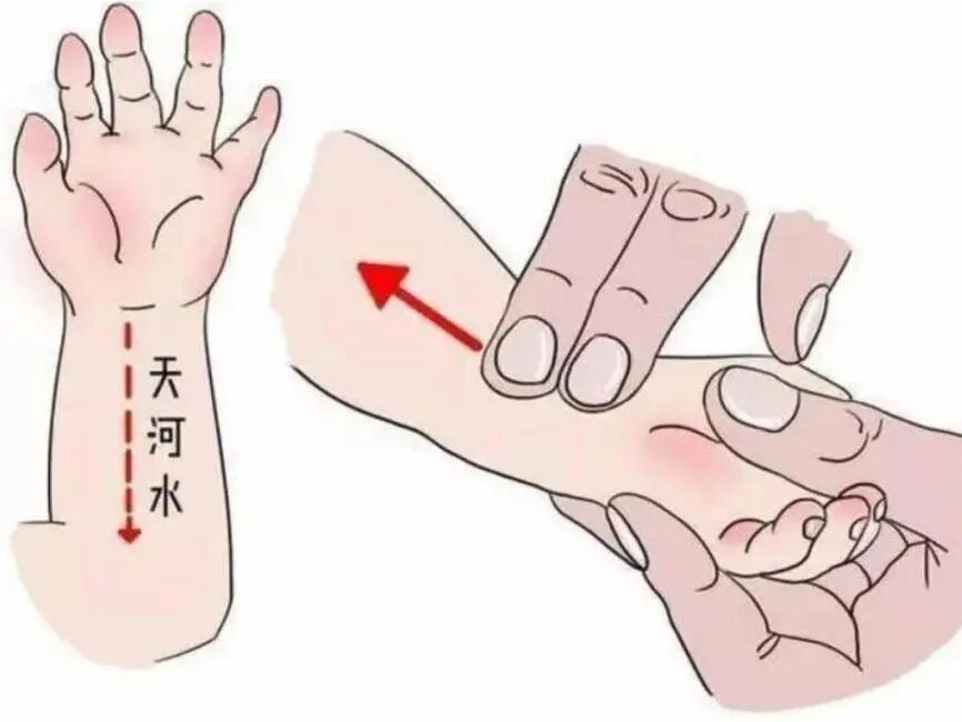 清天河水(前臂正中,从腕到肘推100次)退热;