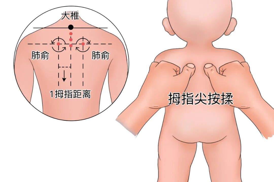 风寒加推三关(前臂桡侧,推100次);风热加推六腑(前臂尺侧,推100次);痰多加揉丰隆(小腿外侧,按揉30次)。