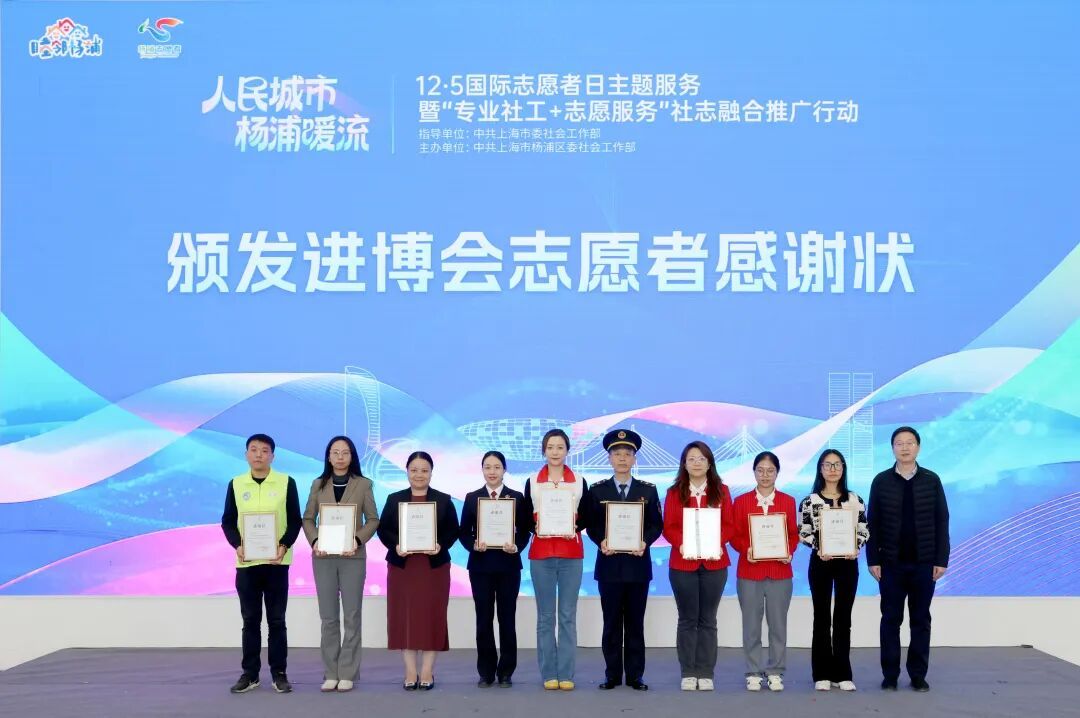 现场,为进博会志愿者代表颁发感谢状,向他们的辛勤付出致以崇高敬意。上海市社会工作者协会会长、华东理工大学社会工作与社会政策研究院副院长范斌现场解读“社志融合”联动模式与试点成效。