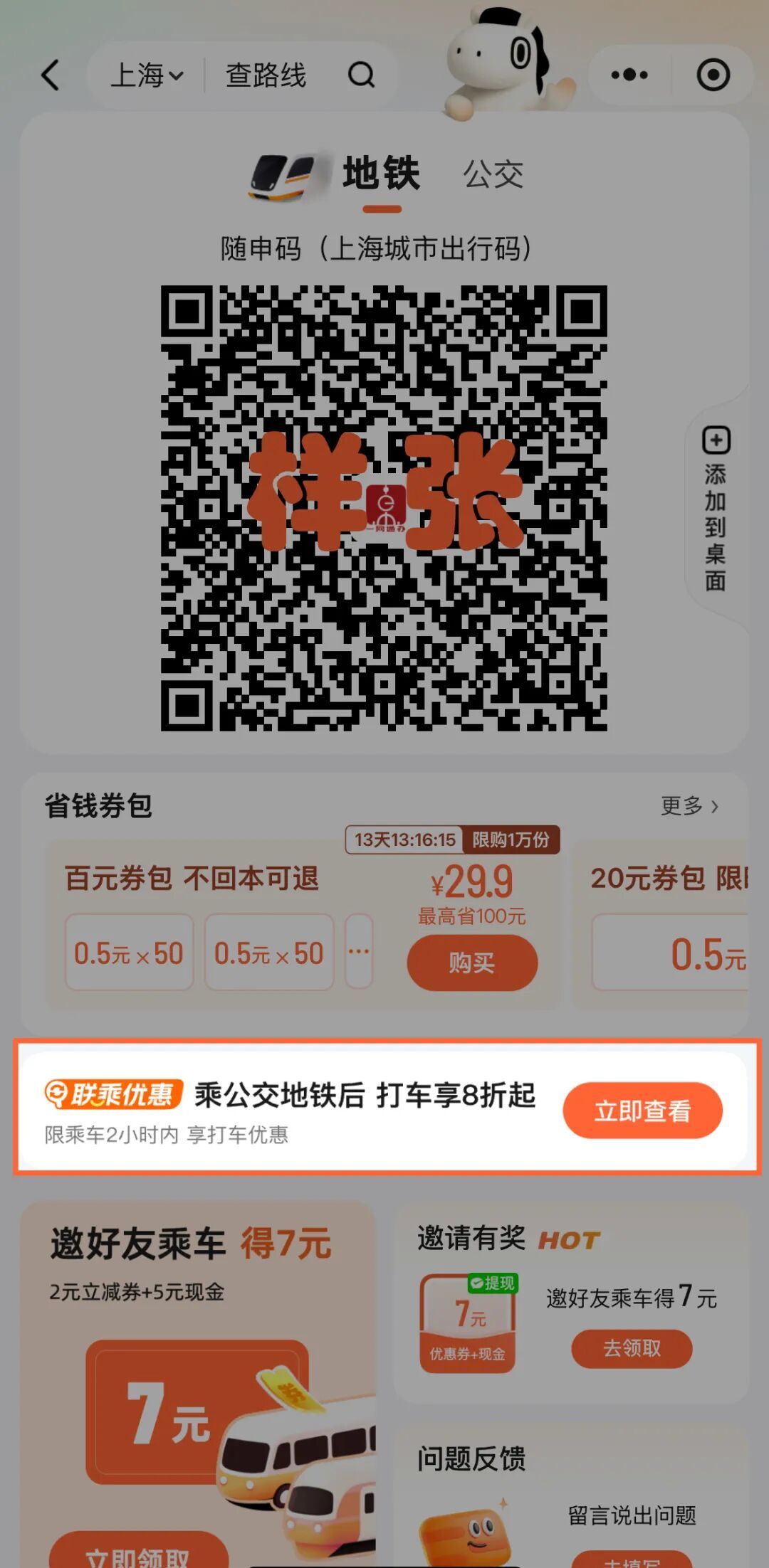 乘坐一次上海公交或地铁,行程结束后的2小时内,通过该出行平台打车,系统将自动抵扣8折优惠(每日1次,最高减免10元);