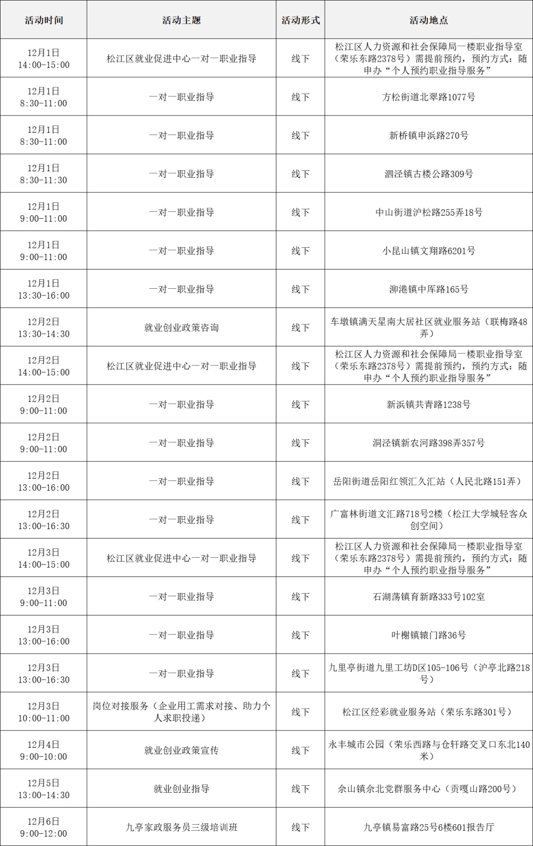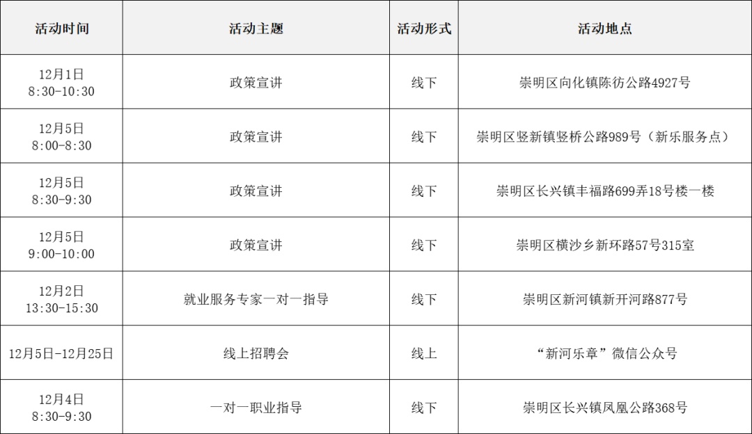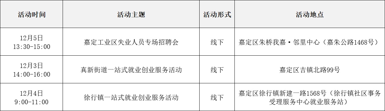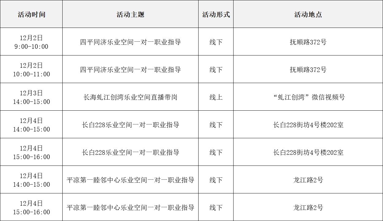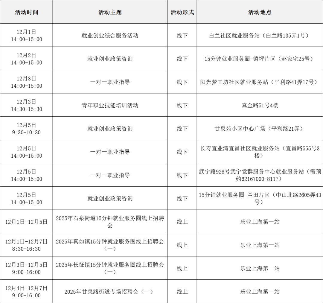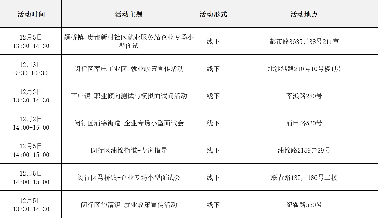 就业服务活动丰富多彩 “乐业上海优+”行动持续进行中! 为了更好地帮助大家拓宽就业机会 提供更优质的公共就业服务举措 全市216场就业服务活动 喊你来参加! …… 以下信息仅供参考 具体以现场实际举办为准 “乐业上海优+”活动安排表 宝山区 静安区 青浦区 黄浦区 松江区 浦东新区 长宁区 奉贤区 普陀区 虹口区 崇明区 闵行区 徐汇区 杨浦区 金山区 嘉定区 本期特色活动 嘉定区 活动主题: 嘉定工业区失业人员专场招聘会 活动时间: 12月5日 13:30—15:00 活动介绍: 活动特邀黎明保险经纪有限公司上海分公司、上海驾运汽车租赁有限公司、梓诚(上海)家政服务有限公司等优质企业参与,提供保险经纪人、保险协赔师、风险评估师、海外保险专员、司机、家政经纪人、护理员等岗位。活动现场同时设立就业服务、创业指导、职业技能培训等服务专区,邀请专家为求职者提供职业方向规划、应聘能力提升、创业政策咨询等精细化公共就业创业指导服务。 服务站点: 嘉定工业区朱桥我嘉邻里中心15分钟就业服务站(请点击查看站点详情) 长宁区 活动主题: 长宁区周家桥街道凝业周桥河畔站“一对一”专家指导 活动时间: 12月2日(周二)14:00—15:30 活动介绍: 本次活动特邀请长宁区就业服务专家现场开展“一对一”职业指导服务。该就业服务专家是资深实战派职业规划导师,具备十余年人力资源行业经验,对于简历优化、职业规划、面试辅导等具备丰富经验和实战经历。就业服务专家将会结合求职者个性特点展开深入细致分析,量身定制个性化职业规划方案,同时结合实际案例传授一些实用的应对策略和技巧,助力青年大学生、失业青年等群体精准定位职业方向,增强职场竞争力,帮助求职者紧扣求职关键环节,把握求职主动权。 服务站点: 周家桥街道凝业周桥河畔15分钟就业服务站(请点击查看站点详情) 浦东新区 活动主题: 浦兴路街道职业指导讲座 活动时间: 12月2日 14:30—15:30 活动介绍: 本次活动特邀资深高级职业规划师、国家二级心理咨询师,以及拥有逾15年企业管理实战经验的上海市就业服务专家,凭借丰富的行业积淀与深厚的专业知识,为求职者精心打造一场专业的职业指导讲座。讲座内容涵盖求职趋势解析、简历优化策略、面试技巧提升及职业规划指导等多方面求职能力强化训练。 服务站点: 浦兴路街道浦三社区15分钟就业服务站(请点击查看站点详情) 杨浦区 活动主题: 四平同济乐业空间一对一职业指导 活动时间: 12月2日 10:00—11:00 活动介绍: 邀请就业指导专家,与求职者进行面对面交流,提供面试技巧、简历优化、职业生涯规划等方面个性化咨询。 服务站点: 四平同济乐业空间15分钟就业服务站(请点击查看站点详情)