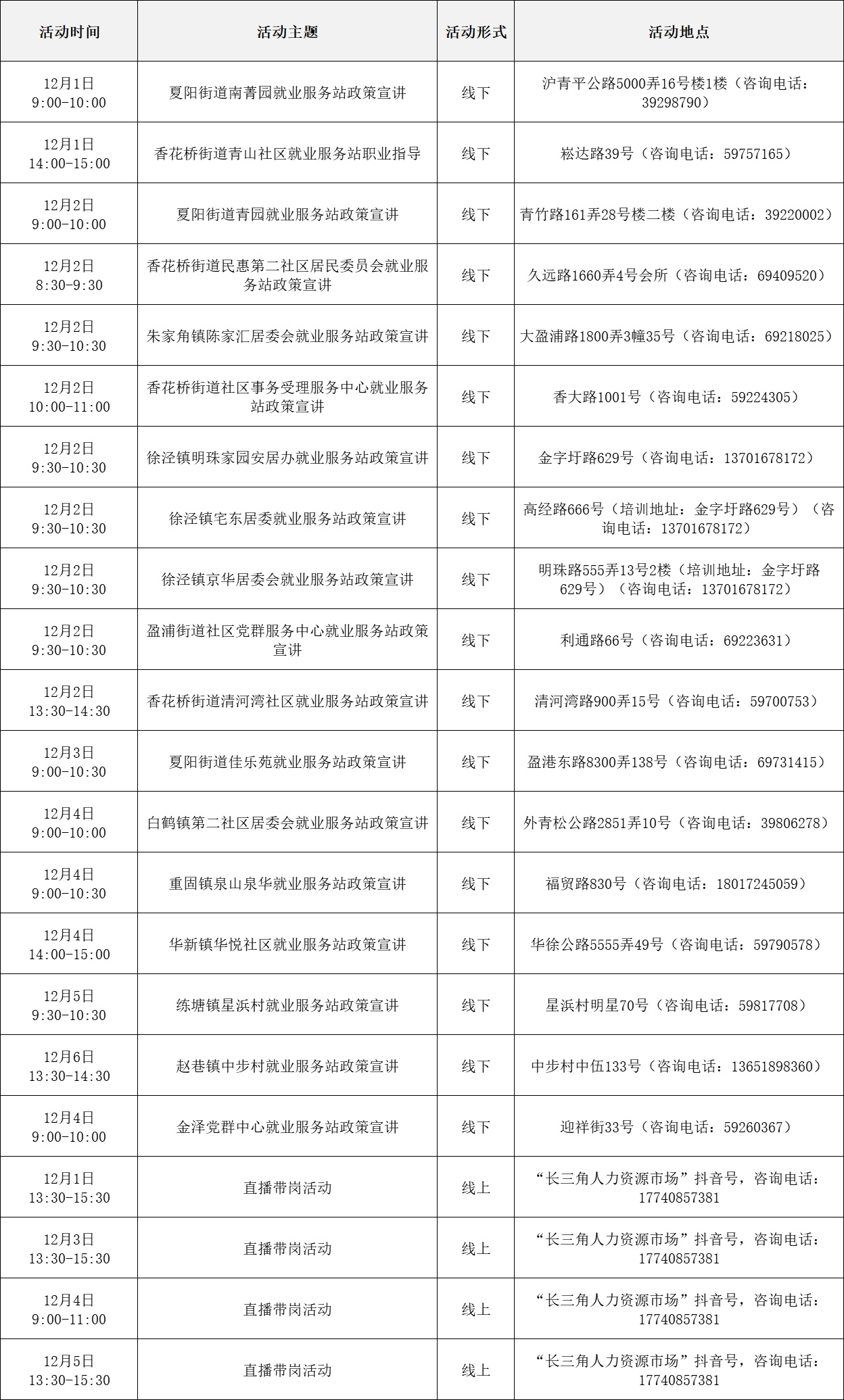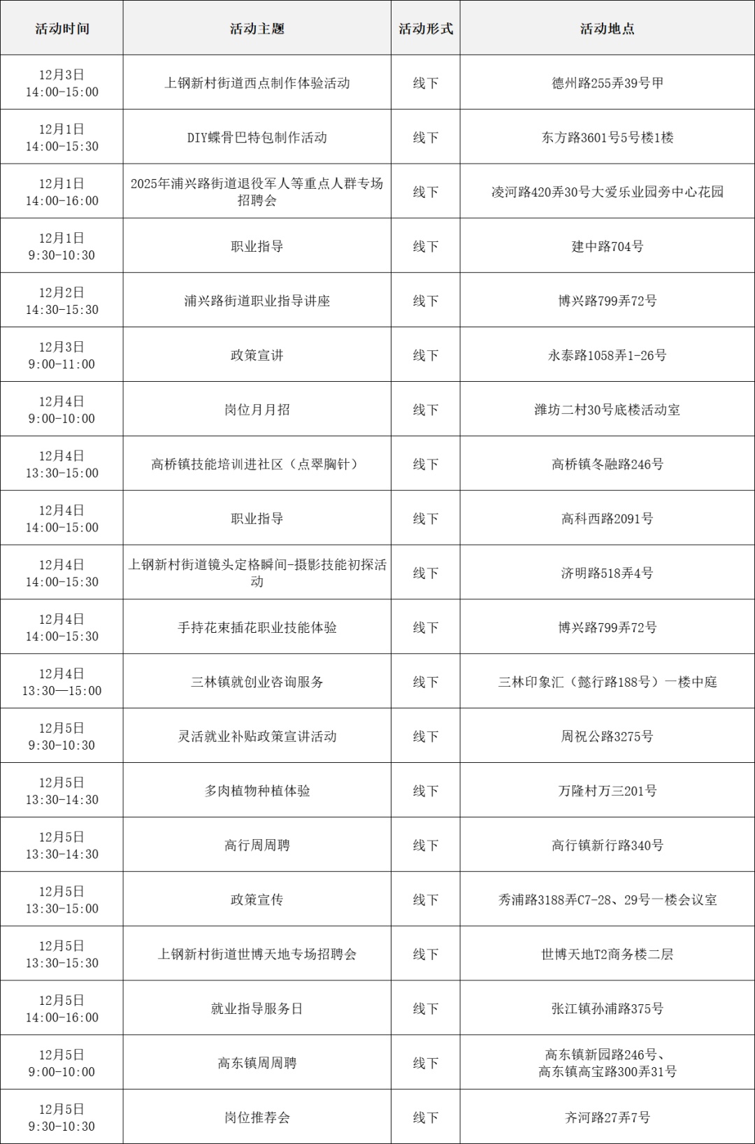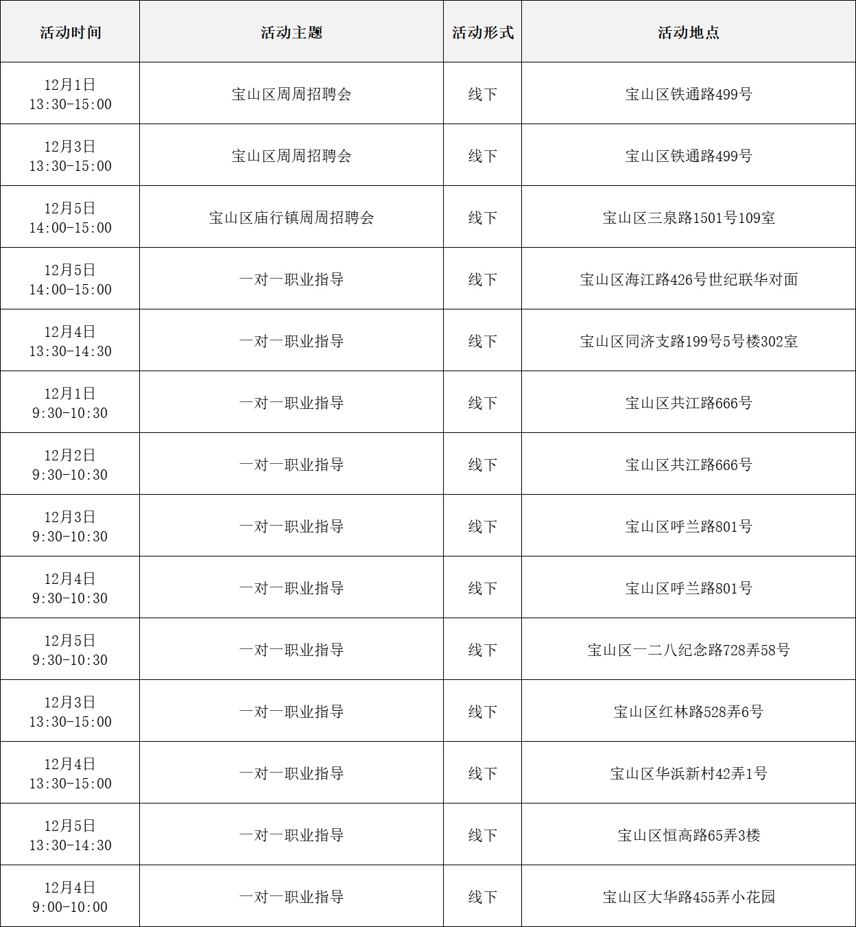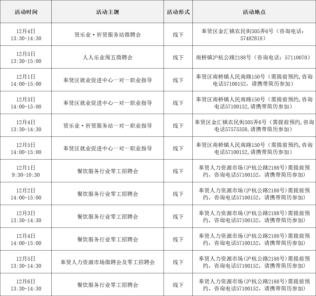 就业服务活动丰富多彩 “乐业上海优+”行动持续进行中! 为了更好地帮助大家拓宽就业机会 提供更优质的公共就业服务举措 全市216场就业服务活动 喊你来参加! …… 以下信息仅供参考 具体以现场实际举办为准 “乐业上海优+”活动安排表 宝山区 静安区 青浦区 黄浦区 松江区 浦东新区 长宁区 奉贤区 普陀区 虹口区 崇明区 闵行区 徐汇区 杨浦区 金山区 嘉定区 本期特色活动 嘉定区 活动主题: 嘉定工业区失业人员专场招聘会 活动时间: 12月5日 13:30—15:00 活动介绍: 活动特邀黎明保险经纪有限公司上海分公司、上海驾运汽车租赁有限公司、梓诚(上海)家政服务有限公司等优质企业参与,提供保险经纪人、保险协赔师、风险评估师、海外保险专员、司机、家政经纪人、护理员等岗位。活动现场同时设立就业服务、创业指导、职业技能培训等服务专区,邀请专家为求职者提供职业方向规划、应聘能力提升、创业政策咨询等精细化公共就业创业指导服务。 服务站点: 嘉定工业区朱桥我嘉邻里中心15分钟就业服务站(请点击查看站点详情) 长宁区 活动主题: 长宁区周家桥街道凝业周桥河畔站“一对一”专家指导 活动时间: 12月2日(周二)14:00—15:30 活动介绍: 本次活动特邀请长宁区就业服务专家现场开展“一对一”职业指导服务。该就业服务专家是资深实战派职业规划导师,具备十余年人力资源行业经验,对于简历优化、职业规划、面试辅导等具备丰富经验和实战经历。就业服务专家将会结合求职者个性特点展开深入细致分析,量身定制个性化职业规划方案,同时结合实际案例传授一些实用的应对策略和技巧,助力青年大学生、失业青年等群体精准定位职业方向,增强职场竞争力,帮助求职者紧扣求职关键环节,把握求职主动权。 服务站点: 周家桥街道凝业周桥河畔15分钟就业服务站(请点击查看站点详情) 浦东新区 活动主题: 浦兴路街道职业指导讲座 活动时间: 12月2日 14:30—15:30 活动介绍: 本次活动特邀资深高级职业规划师、国家二级心理咨询师,以及拥有逾15年企业管理实战经验的上海市就业服务专家,凭借丰富的行业积淀与深厚的专业知识,为求职者精心打造一场专业的职业指导讲座。讲座内容涵盖求职趋势解析、简历优化策略、面试技巧提升及职业规划指导等多方面求职能力强化训练。 服务站点: 浦兴路街道浦三社区15分钟就业服务站(请点击查看站点详情) 杨浦区 活动主题: 四平同济乐业空间一对一职业指导 活动时间: 12月2日 10:00—11:00 活动介绍: 邀请就业指导专家,与求职者进行面对面交流,提供面试技巧、简历优化、职业生涯规划等方面个性化咨询。 服务站点: 四平同济乐业空间15分钟就业服务站(请点击查看站点详情)