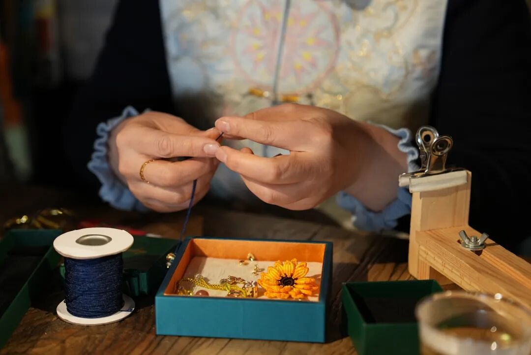 在“景泰文创”工作室内,一场精彩的技艺展示正在上演。工艺师手持镊子,将铜丝精准弯折成精美的传统纹样,随后,釉料在铜丝间缓缓流淌、填充,仿佛为金属赋予了鲜活的生命。这一拥有六百余年历史的“铜胎掐丝琐琅”技艺,引得围观者阵阵惊叹。更令人眼前一亮的是,工作室大胆创新,将景泰蓝与传统饰品巧妙融合,设计出一系列兼具传统韵味与现代审美的手串、吊坠等时尚配饰。据工作室负责人透露,每月推出的景泰蓝手串DIY课程预约十分火爆,其中20至35岁的年轻人占比高达八成,这充分显示出传统工艺在年轻群体中具有强大的吸引力。
