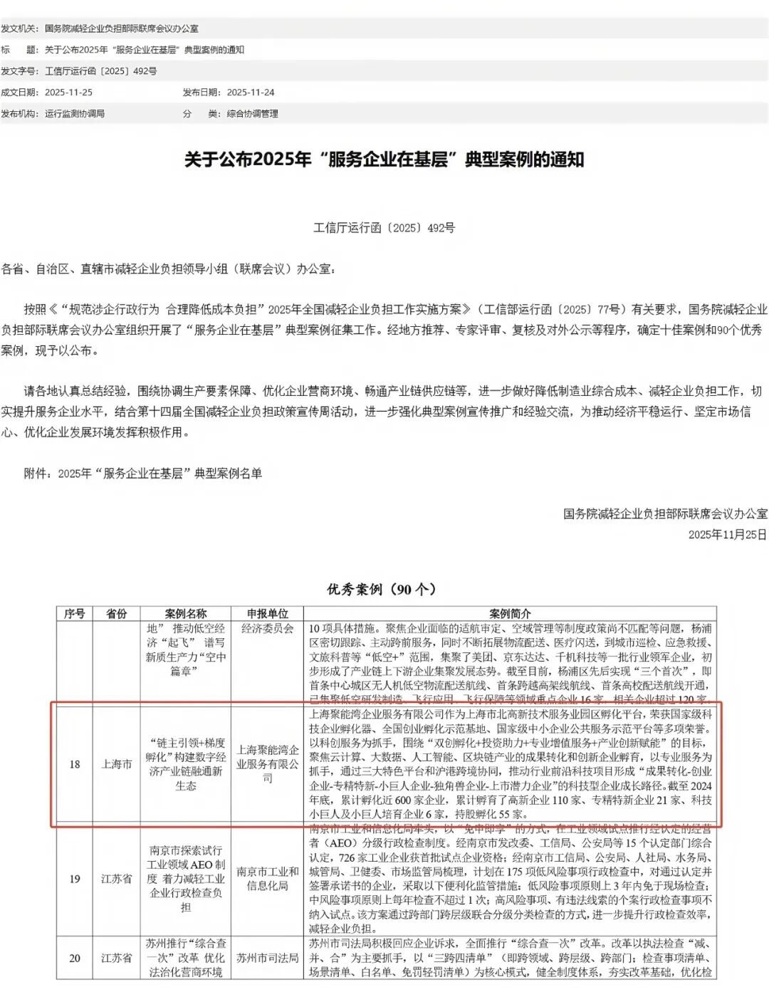近日,国家工业和信息化部公布2025年“服务企业在基层”典型案例评选结果,市北高新聚能湾创新创业中心申报的《“链主引领+梯度孵化”构建数字经济产业链融通新生态》成功入选,成为上海市唯一上榜的孵化器平台。