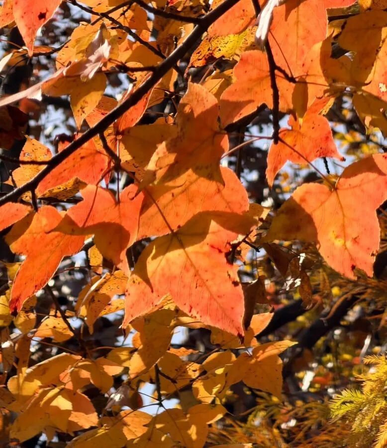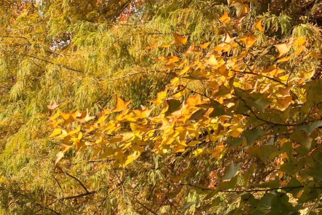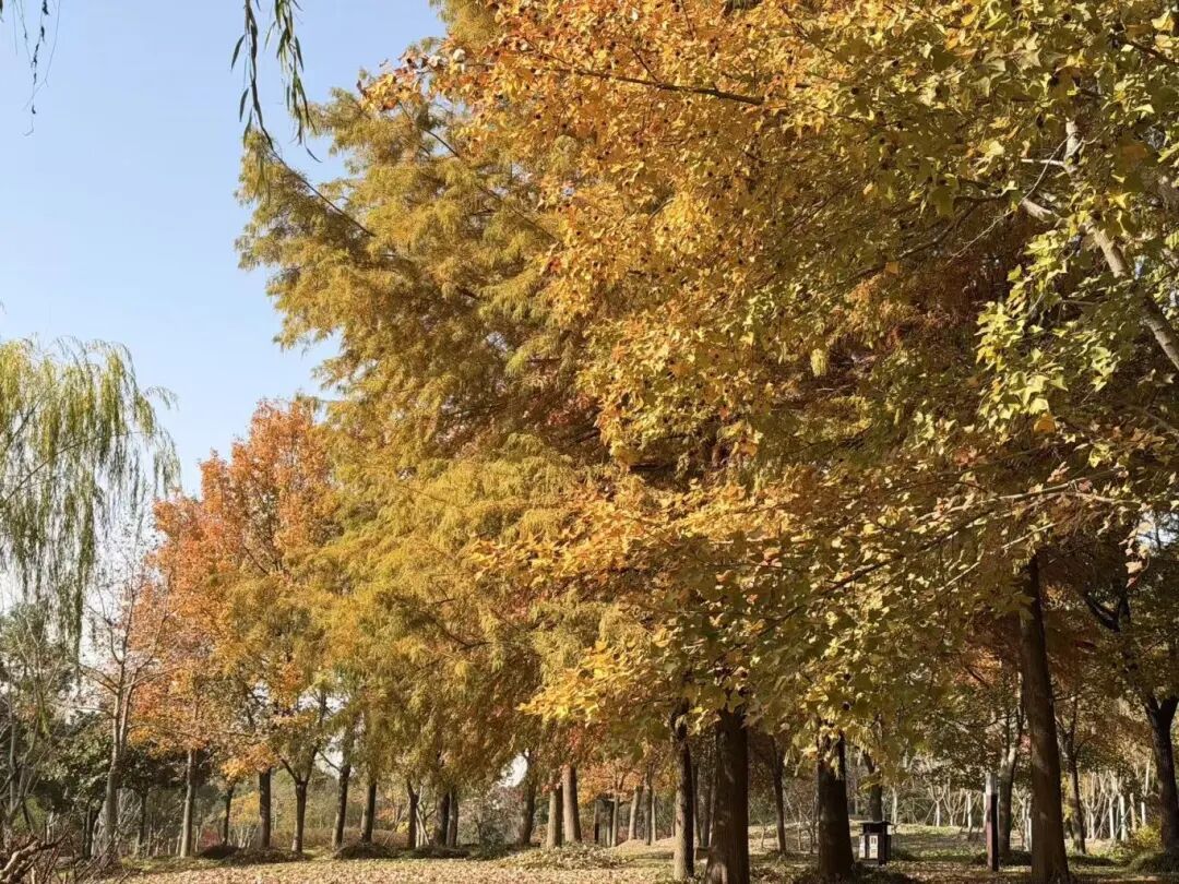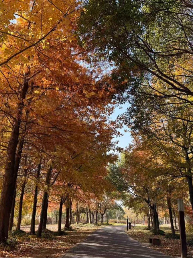 在公园1号门附近的枫香路,高大的枫香树与水杉并肩而立,将道路渲染成温暖的焦糖色。阳光洒下,枫香叶片呈现出橘红、金黄等渐变色彩,宛如步入童话世界。