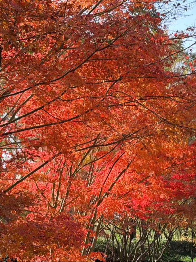 3号门附近的红枫林则以其鲜艳的红色,为秋日增添了一抹亮色,在蓝天映衬下更显绚丽。