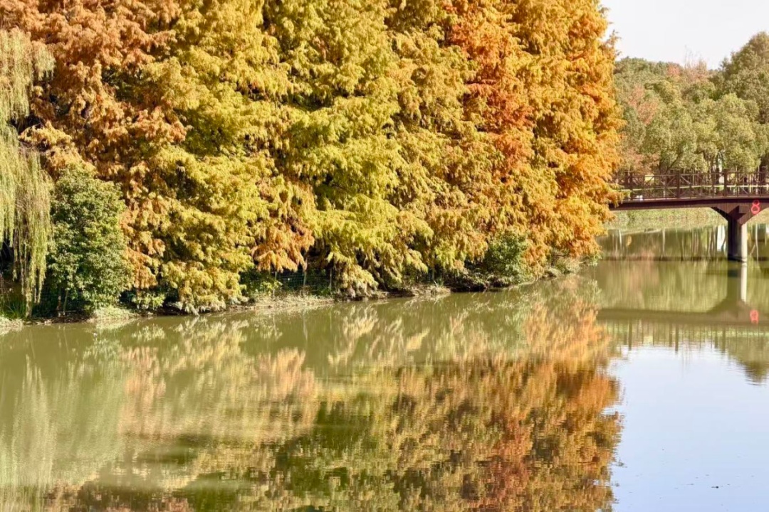 2号门彩虹桥畔,水杉林正悄然换装,橘黄相间的树冠与水中倒影相映成趣。
