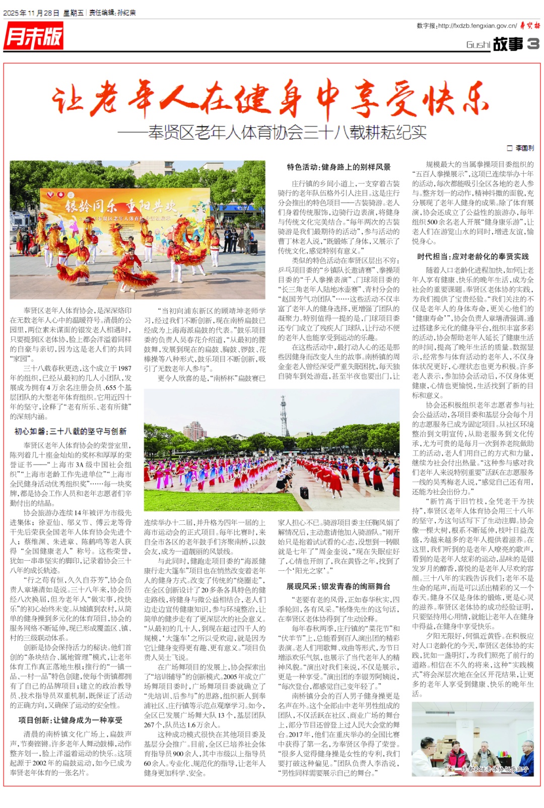 随着人口老龄化进程加快,如何让老年人享有健康、快乐的晚年生活,成为全社会的重要课题。奉贤区老体协的实践,为我们提供了宝贵经验。“我们关注的不仅是老年人的身体寿命,更关心他们的‘健康寿命’”,协会负责人章墡清强调。通过搭建多元化的健身平台,组织丰富多彩的活动,协会帮助老年人延长了健康生活的时间,提高了晚年生活的质量。数据显示,经常参与体育活动的老年人,不仅身体状况更好,心理状态也更为积极。许多老人表示,参加协会活动后,不仅身体更健康,心情也更愉悦,生活找到了新的目标和意义。 协会还积极组织老年志愿者参与社会公益活动,各项目委和基层分会每个月的志愿服务已成为固定项目。从社区环境整治到文明宣传,从助老服务到文化传承,尤为可贵的是每月一次到养老院做助工的活动,老人们用自己的方式和力量,继续为社会付出热量。“这种参与感对我们老年人来说特别重要。”活跃在志愿服务一线的吴秀梅老人说,“感觉自己还有用,还能为社会出份力。” “新竹高于旧竹枝,全凭老干为扶持”,奉贤区老年人体育协会用三十八年的坚守,为这句话写下了生动注脚。协会像一棵大树,根系不断延伸,枝叶日益茂盛,为越来越多的老年人提供着滋养。在这里,我们听到的是老年人嘹亮的歌声,看到的是老年人炫彩的运动,品味的是银发岁月的醇香,喜悦的是老年人尽欢的容颜。三十八年的实践告诉我们:老年不是生命的尾声,而是可以活出精彩的又一个春天。健身不仅是身体的锻炼,更是心灵的滋养。奉贤区老体协的成功经验证明,只要坚持用心用情,就能让老年人在健身中得益,在健身中享受快乐。 夕阳无限好,何惧近黄昏。在积极应对人口老龄化的今天,奉贤区老体协的实践,犹如一盏明灯,为我们照亮了前行的道路。相信在不久的将来,这种“实践模式”将会深层次地在全区开花结果,让更多的老年人享受到健康、快乐的晚年生活。