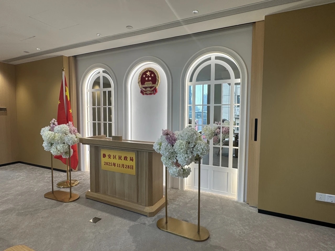 静安国际会客厅所在区域承载着从19世纪末愚园延续至今的历史文脉,历经从名流云集的园林,到功能复合的城市航站楼,再至当下集政务服务、商务交流、文化展示于一体的国际化综合服务平台的变迁。静安区民政局依托该载体设立涉外婚姻登记专窗,是对区域历史文化的传承,也是对现代公共服务多元化需求的精准回应。