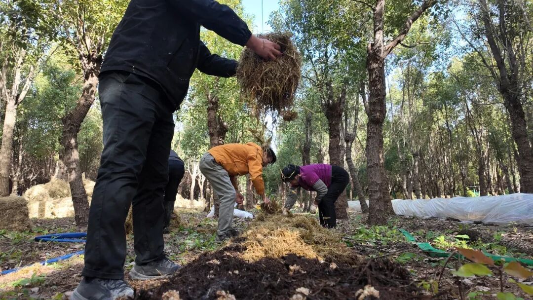 走进菌菇种植区,林间沿途堆叠着层层稻草,树林下,一排排几十米长的白色暖棚格外醒目,棚内是已经种好的赤松茸。工人们有条不紊地忙碌着:先将打散的稻草均匀铺展在地面,再覆上一层经过发酵的秸秆。“这些秸秆刚铺下时还带着余温,温度能达七八十度,得等它自然降温后才能植入菌丝。”陈超介绍。