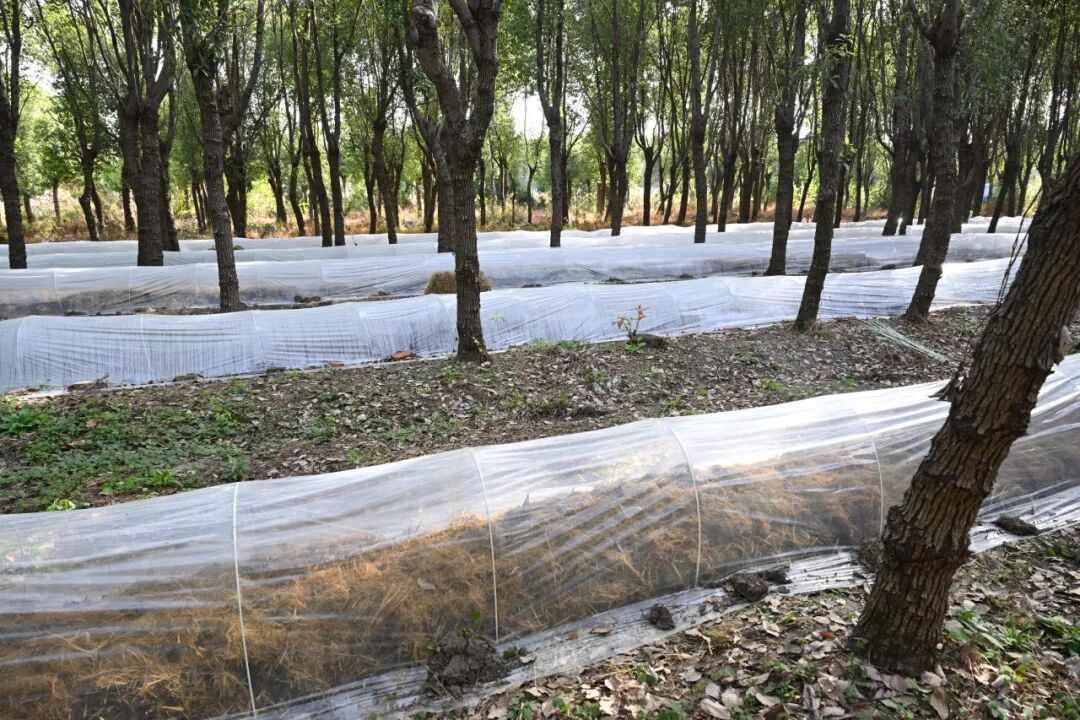 随后,工人们将菌丝轻轻放置在秸秆表面,再覆盖一层湿润的稻草,最后盖上一层塑料薄膜。这样,一垄垄赤松茸的种植就大功告成了。“加盖暖棚不仅能精准控温保湿,还能有效隔绝虫蚁侵害。”陈超表示,“相比往年露天种植,现在采摘期能提前半个多月。”
