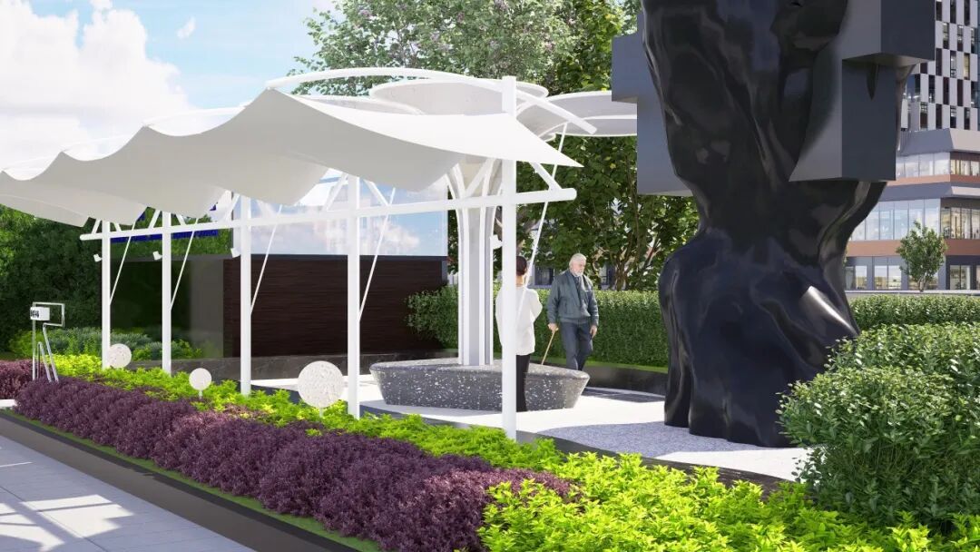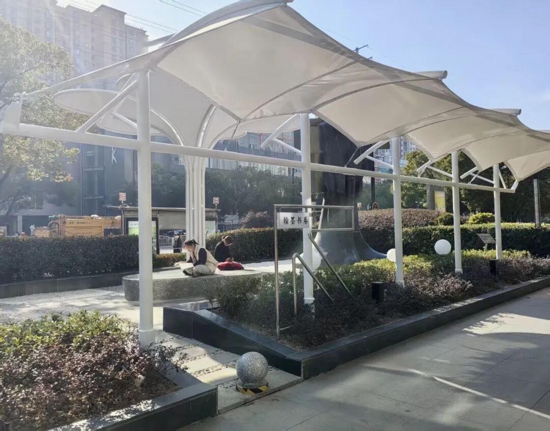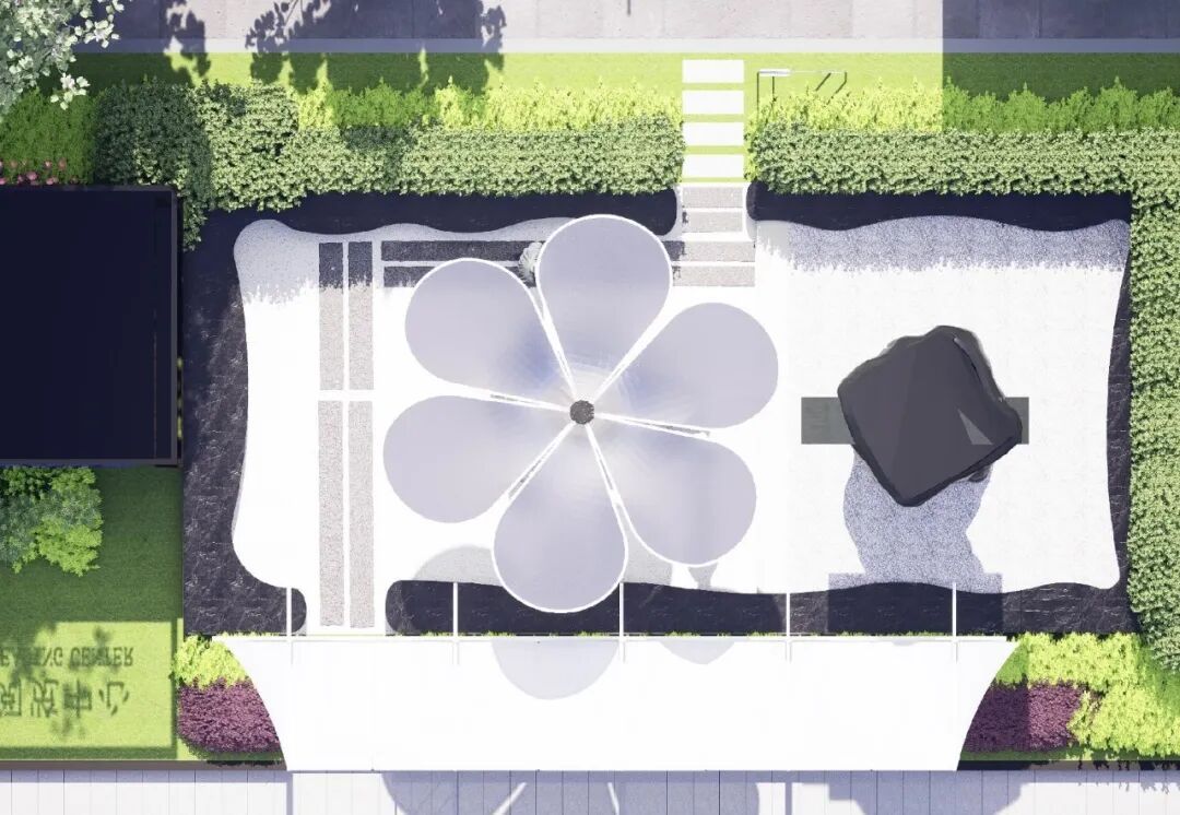 改造后的景观,处处透着精心设计的巧思。核心景观“六叶花瓣”装置最为亮眼——它借鉴植物生长的“松弛感”,用舒展的弧线柔化周边建筑的硬朗线条,多根“花茎”支柱从地面自然“生长”;旁边的长轴书卷白色膜棚,则将“摊开的书卷”与“绽放的花瓣”做了意象融合,与原有翰墨雕塑相得益彰,形成“翰墨书卷”的独特景观组合。