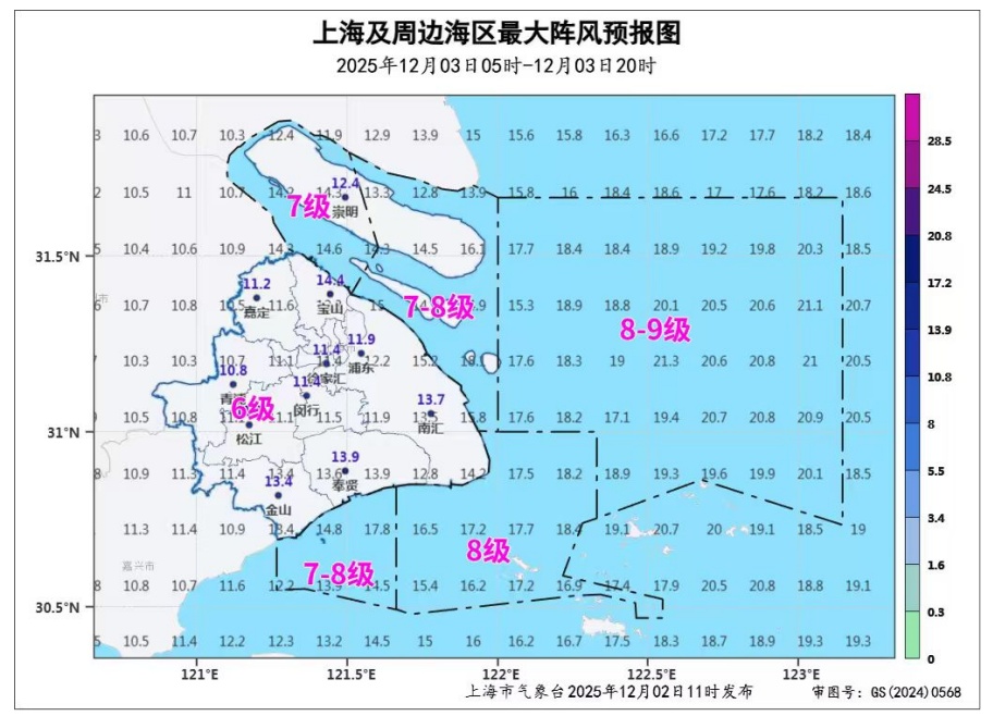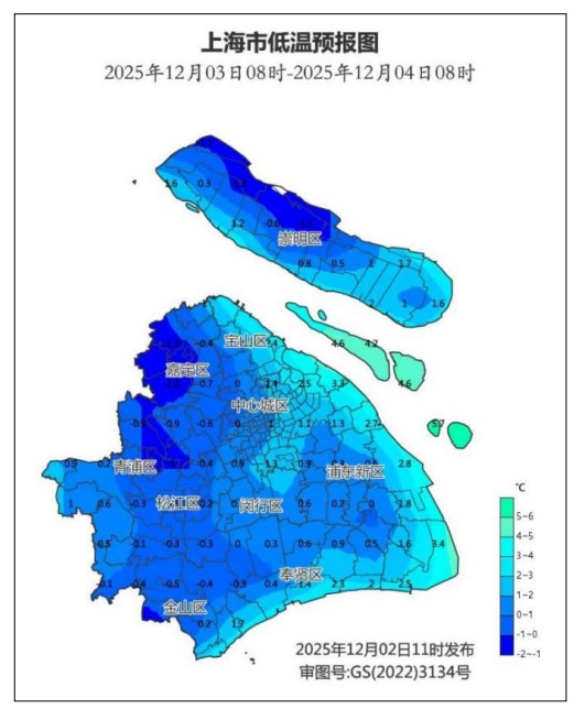 今天下半夜起较强冷空气开始影响本区,将出现明显降温和大风,48小时最低气温降幅8-10℃,最低气温-2℃左右(出现在4日早晨),有薄冰;今天下半夜到明天白天最大阵风6级,长江口区7-8级。