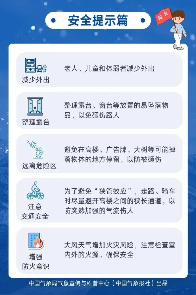 1、建议加强防范大风对水上和高空作业的影响,做好简易搭建物、室外物品及户外广告牌等的防风加固措施。