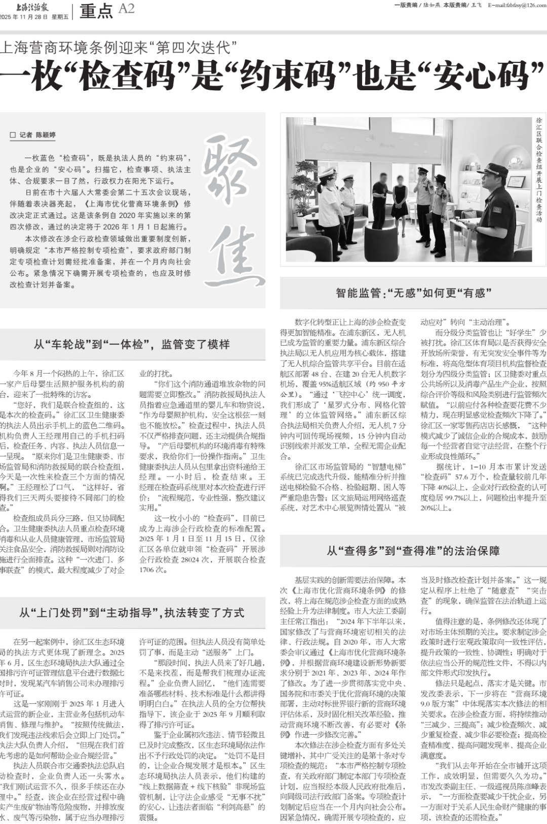 2025年11月28日出版的《上海法治报》第二版刊登了题为《一枚“检查码”是“约束码”也是“安心码”——上海营商环境条例迎来“第四次迭代”》的专版报道。