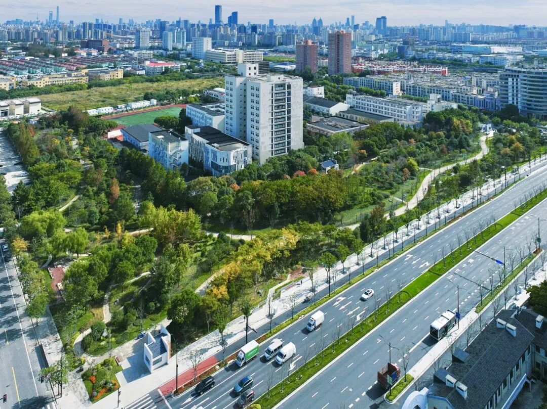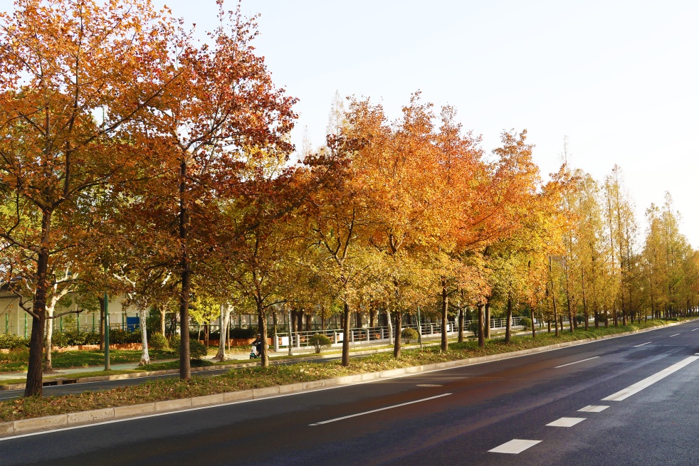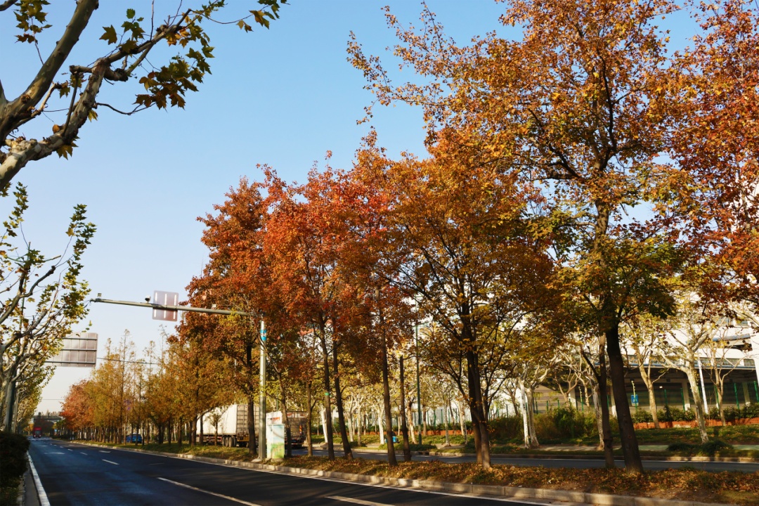 不只是联通普陀、宝山与长宁的交通干道,也是一条流动的风景线。路旁树木整齐排列,枝叶仍缀满鲜活绿意,零星橙黄点缀其间,未见萧索、更显生机。偶尔一阵风过,几片彩叶翩跹而落,为繁忙的城市节奏添上一笔温柔注脚,让通勤之路也浸着自然的清新。
