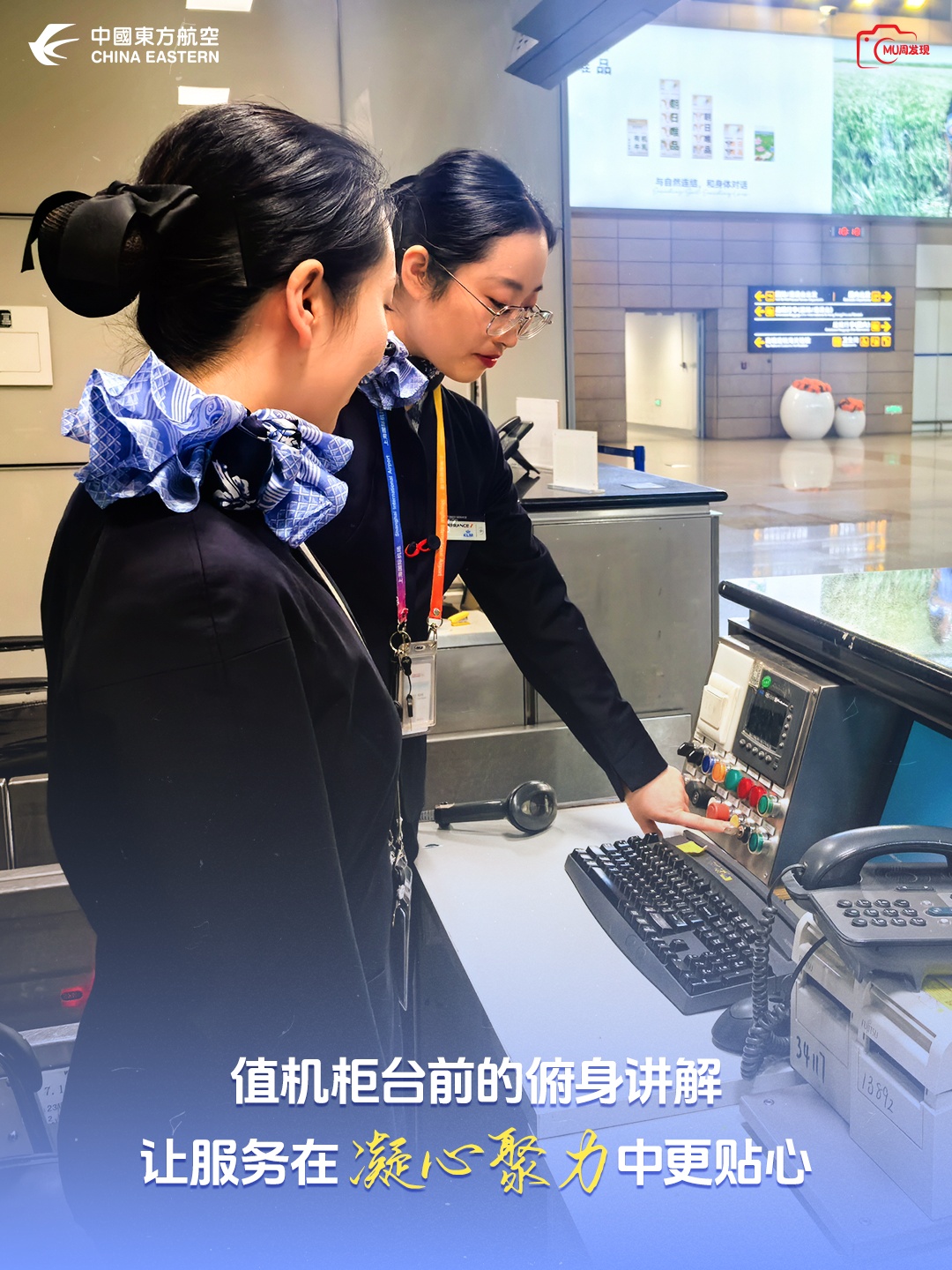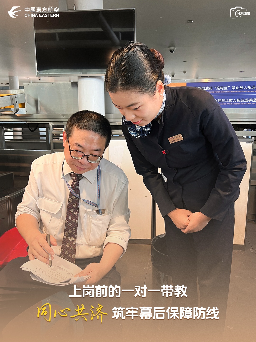 【值机柜台前,资深值机员段明作为“老师傅”用心解析传授离港业务流程要点,将岗位作业规范一条一条讲解,上岗第一天的“职场小白”俯身恭耳以请,用心倾听,凝神领会,不时地询问专业名词,两人一讲一记的节奏里,是地服岗位 “老带新” 的团结传承。团结,就藏在每一次同频的专注里。—— 武汉公司 段明】