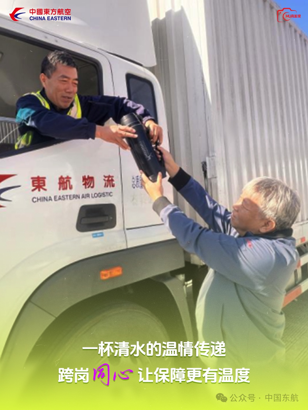【东航运输西区车队作业经理施扣金将暖壶递给驾驶员龚玉良,叮嘱道:“道路千万条,安全第一条。” 一杯热茶驱散了凉意,一句嘱咐饱含关怀。这合作的默契,是团结在日常里的温柔具象。—— 东航物流 施扣金】