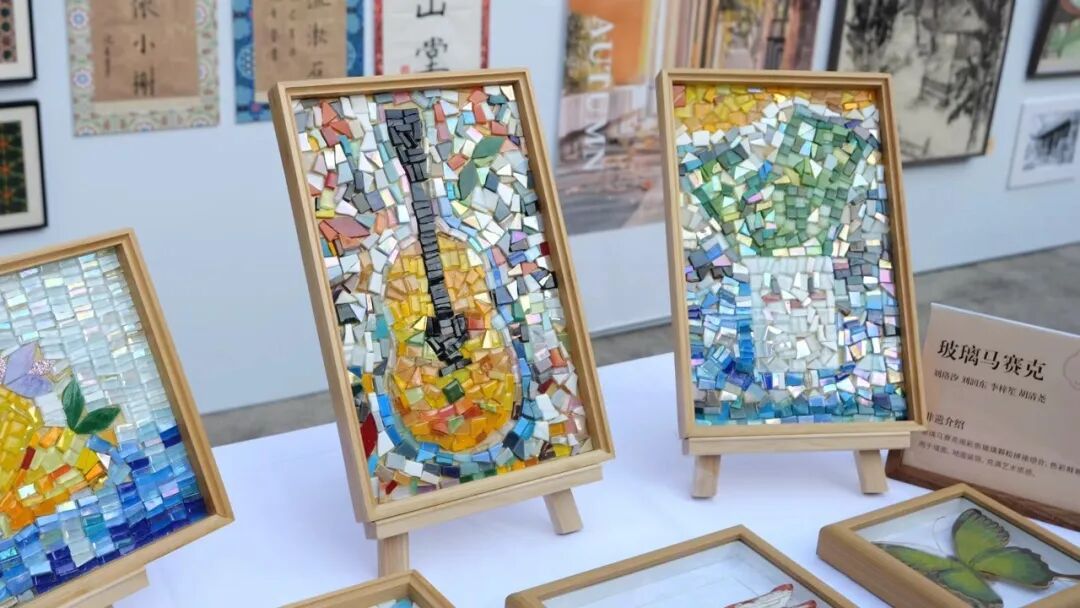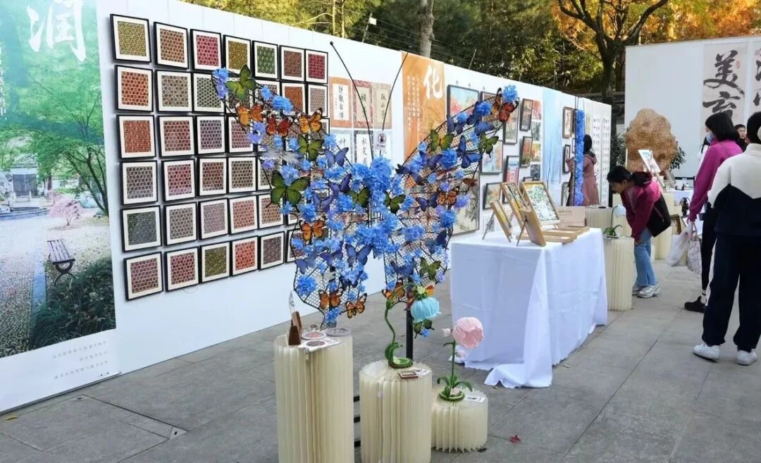走出特展厅,来到嘉定博物馆后院,启良中学的美育成果在此集中展示,学生们所绘不同角度、不同笔触的秋霞圃美景与不远处的垂柳红枫呼应;精致的竹编、安亭药斑布、蝴蝶装置等手工艺品更是让人忍不住拍照。