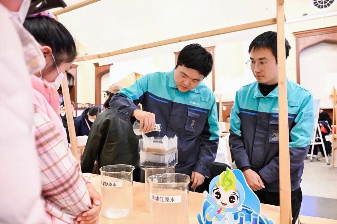与此同时,来自杨树浦水厂“水立方”志愿服务队的志愿者们也带来了一场“小水滴的奇妙旅行”科普互动。通过模拟自来水从取水、沉淀、过滤到消毒的完整净水过程,让大家亲眼见证了一滴普通的水所蕴含的“净化超能力”。