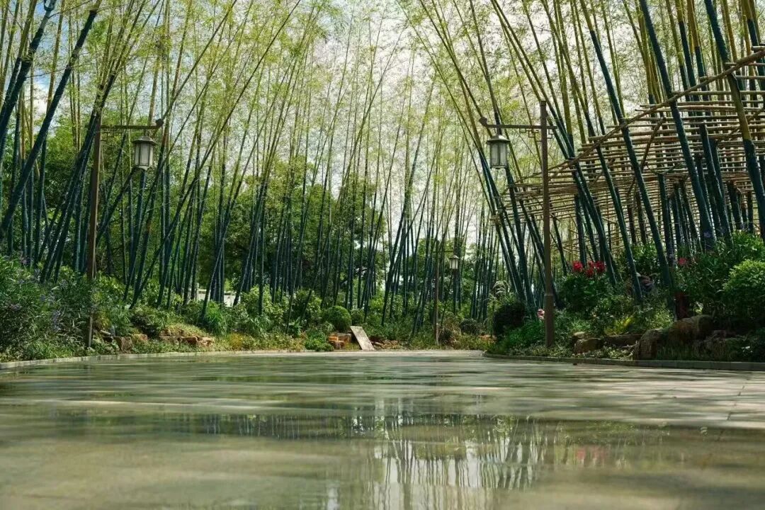 过去,古镇景区入口的铺装风格简单,两侧植被稀疏,空间空旷,缺乏美感。如今,改造后的入口焕然一新,石板铺装让整体风格更显质朴,道路两侧形成“竹林夹径”植物与石景组成精巧的景致。入口亭改建为黛瓦翘檐的中式传统样式,中式窗框透着“一窗一景”的雅致。