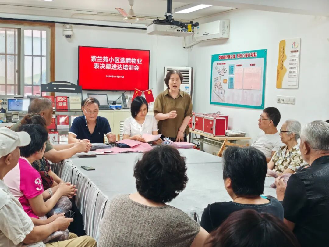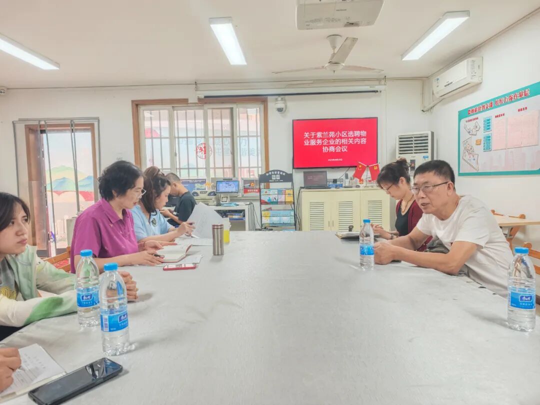 居民区党总支与业委会第一时间联合召开专题会议,统一思想、凝聚共识,明确“平稳过渡、公开比选、业主票决”工作原则,审议通过《紫兰苑小区关于选聘物业企业方案》。