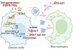 团队还在细胞、CDX模型、人源化CD24的小鼠肺原发成瘤模型和PDX模型中,均发现I类创新药物CD24单抗ATG-031与第三代EGFR-TKI的协同增敏作用。不仅如此,研究团队深入探索了第三代EGFR-TKI处理下CD24表达增高的机制。通过DNA亲和沉淀结合质谱、磷酸化组学、CoIP和3C实验等方法,研究团队发现第三代EGFR-TKI通过JNK激酶诱导YY1 S247磷酸化,增强YY1介导的增强子—启动子环,从而促进CD24表达。