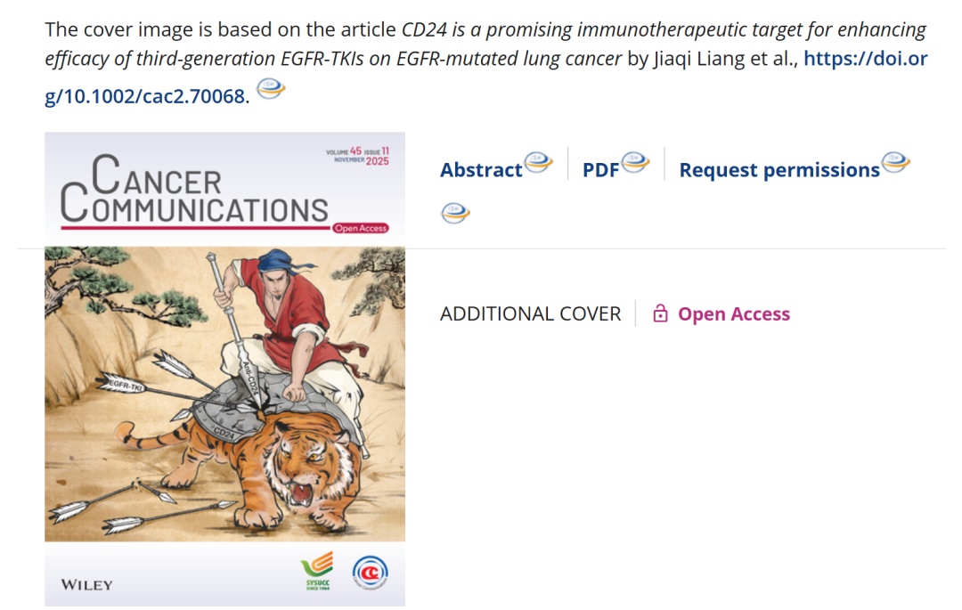 近日,复旦大学附属中山医院胸外科团队,在《Cancer Communications》 (癌症通讯)期刊上发表了一项突破性研究。该研究以封面论文形式呈现,题为《CD24:协同增敏第三代EGFR-TKIs的新兴免疫治疗靶点》。文中指出:创新性药物——靶向CD24的单克隆抗体药物ATG-031可以大幅提升第三代EGFR-TKI的抗癌效果。这一成果不仅揭示了CD24作为肿瘤免疫治疗靶点的重要价值,也为克服EGFR-TKI治疗耐药这一难题提供了新思路。