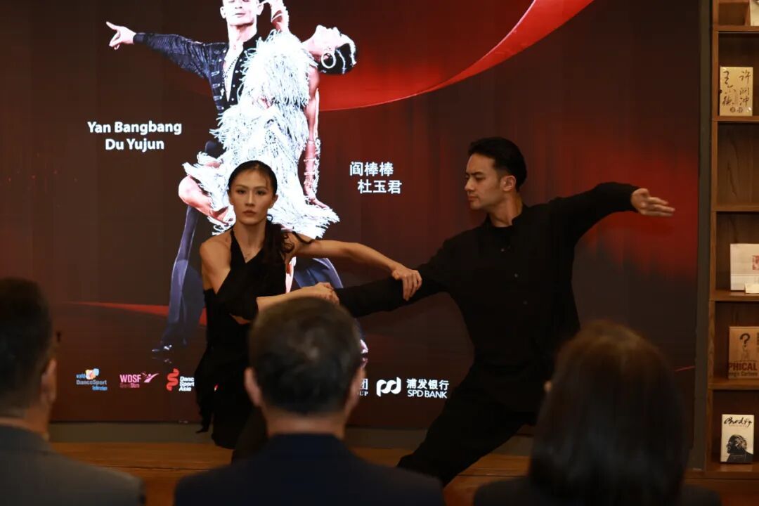 在新闻发布会上,WDSF大奖赛总决赛中国参赛选手阎棒棒/杜玉君带来了精彩表演。