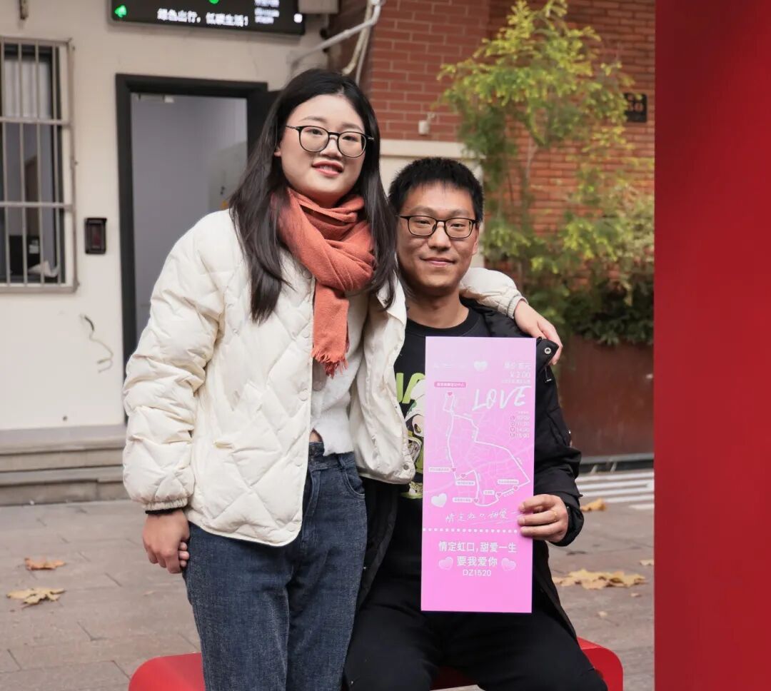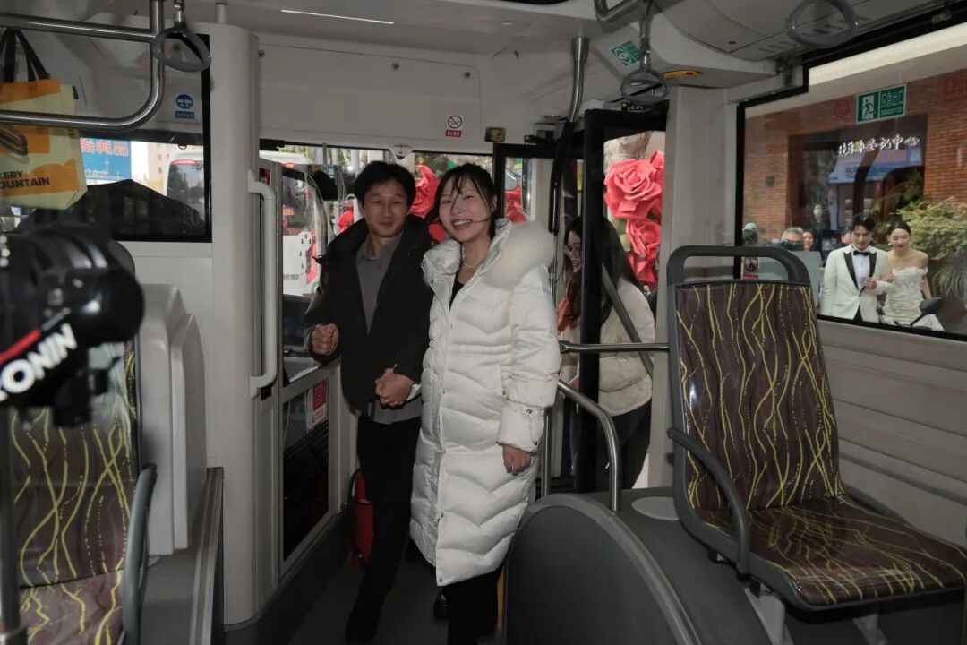 随后,新人们登上了专属的 “甜爱专列”DZ1520定制公交,从全新打造的“甜爱始发站”打卡启程。公交车化身为流动的浪漫风景线,载着满车的笑语与爱意,穿梭在虹口的大街小巷,开启了一场独一无二的城市甜蜜巡游。