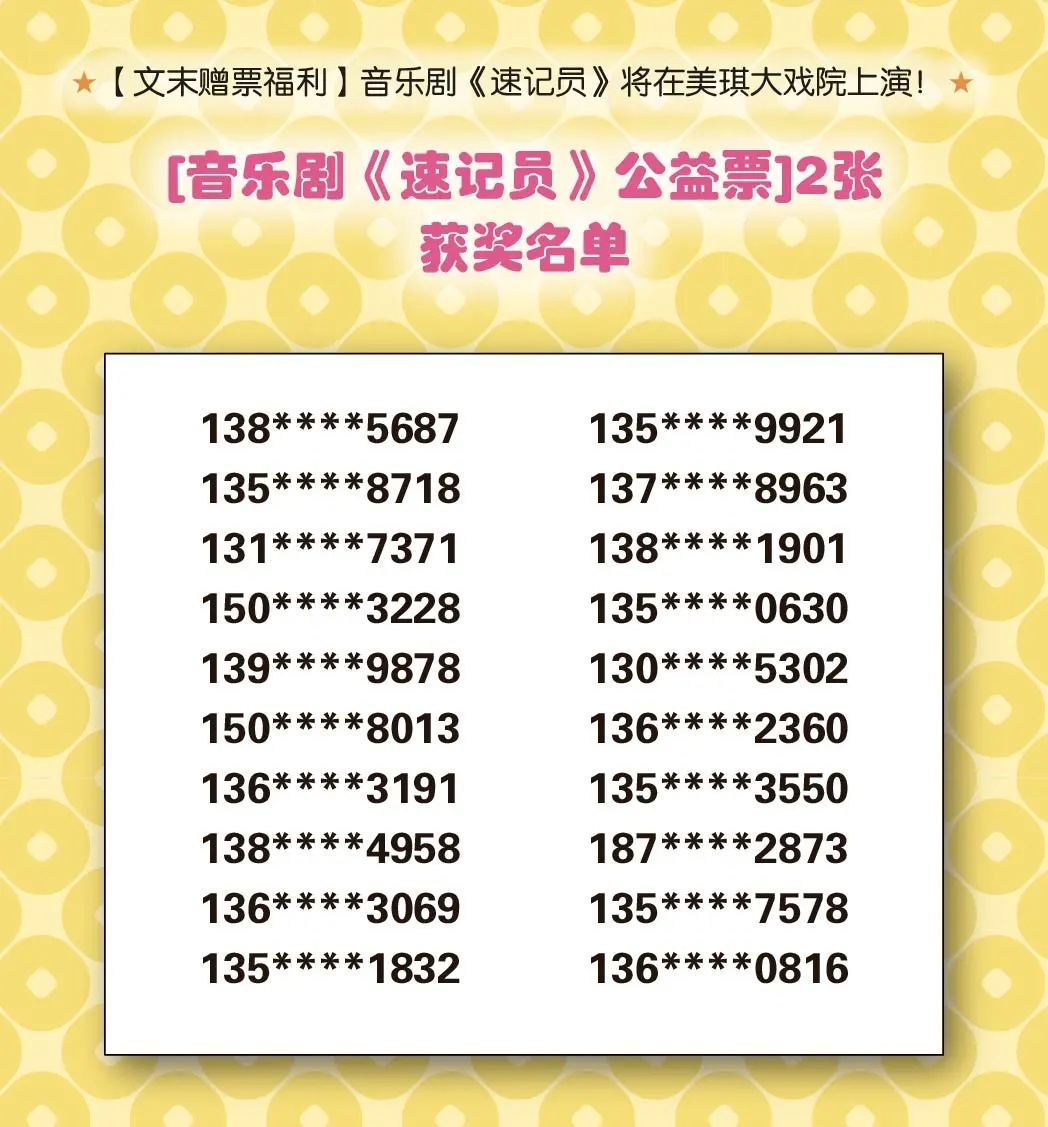 此前静宝推送的《【文末赠票福利】音乐剧《速记员》将在美琪大戏院上演!》中奖名单已经出炉!详见↓