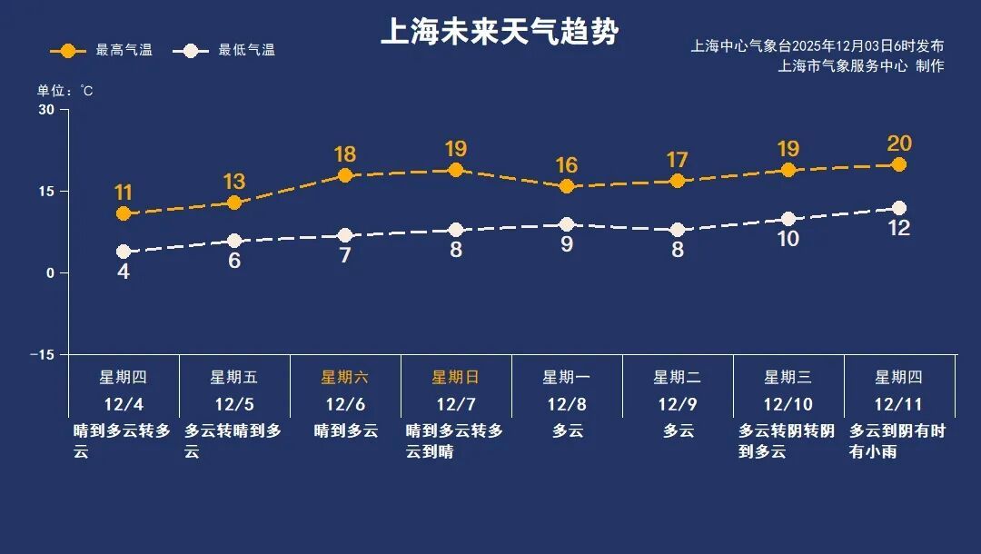 12月4日(周四):晴转多云,4~11℃
