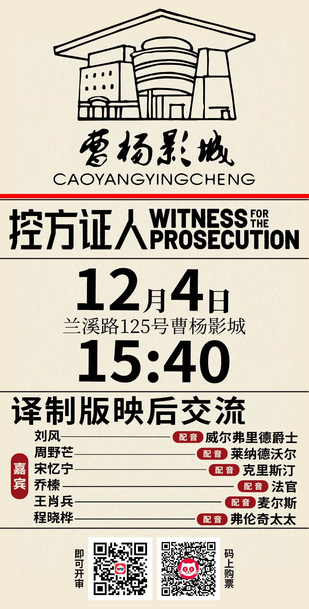对于很多中国观众来说,“外语佳片”往往和一个名字密不可分:上海电影译制厂。《007》《佐罗》《廊桥遗梦》……那些美妙的声音,承载了一代人的童年或青春,为他们打开了通向另一方文化殿堂的大门,也让那些精彩的他乡故事,有了让中国观众念念难忘的“回忆”味道。12月4日,阿加莎·克里斯蒂的悬疑神作《控方证人》译制版将登陆曹杨影城。映后交流环节,刘风、周野芒、宋忆宁、乔榛等配音艺术家将亲临现场,与观众互动交流。 场次信息:15:40(1号4K激光厅) 男主角沃尔由话剧影视配音三栖演员周野芒配音,很多观众对于他的印象来源于央视98版《水浒传》中扮演林冲,但他也曾经为007詹姆斯·邦德配音,他的声音极富感染力,能够精准体现角色的性格,赋予其独特魅力。克里斯汀的配音由同样“会演”的宋忆宁担纲,她作为当之无愧的话剧界常青树,曾获金狮奖、白玉兰戏剧主角奖等荣誉,被誉为“台词大师”。 而律师威尔弗里德爵士的配音工作则由上影译制厂厂长刘风完成,同为“译制腔”时代的代表人物之一,他曾为“熊猫阿宝”“斯内普教授”等观众耳熟能详的角色配音,在配音时会注重结合角色性格和人物背景的他,相信会给个性突出的威尔弗里德爵士更添风采。除此以外,更让观众惊喜的是乔榛、童自荣、曹雷、程晓桦等老一辈大众熟知的配音表演艺术家,都有在电影中精彩献声,经典佳作碰撞经典之声,强强携手为观众带来堪称梦幻的“殿堂级视听盛宴”。 曹杨影城地址: 上海市普陀区兰溪路125号 交通指南: 轨交:地铁11号线(枫桥路站:3号口) 公交:858、837、94、63、948、44、876路。 自驾:兰溪路曹杨商场入口处直行100米到达停车 资料:上影曹杨影城 编辑:吴兴婷 点击下方了解更多 汽车购置税调整在即!现在来普陀购车正当时→ 优质医疗资源“隔空”共享,技术赋能沪皖医生“面对面”交流 【提示】2026年度个税专项附加扣除信息确认开始啦!抓紧确认→ 年末出游旺季,普陀适合“微度假”的场所都给你找好了 此时的桃浦,已经美成这样了……