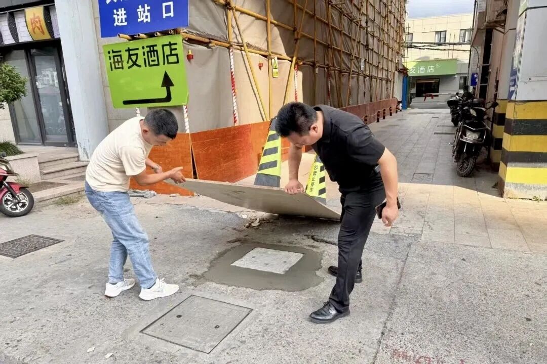 在明确设施权属后,网格工作站迅速启动“吹哨报到”机制,向街道城运中心报告,详细说明隐患位置、实时状况及可能引发的安全风险,协调设置醒目的简易警示标识,提醒往来人员与车辆注意避让,并安排专人引导行人及车辆绕行,有效控制现场秩序,最大限度防范次生风险发生。从接报完整险情信息到专业抢修力量抵达现场,整个过程环环相扣、响应迅速,充分展现了跨部门协同处置的高效性与专业性。