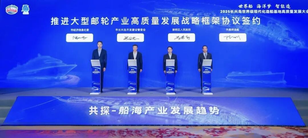 吴召忠、吕晨飞、蒲亚鹏、陈刚共同签署“推进大型邮轮产业高质量发展战略框架协议”,全面支持邮轮链主外高桥造船引领产业链上下游企业集聚长兴岛,塑造现代化造船基地产业创新新引擎,开启中国船舶工业高质量发展新篇章。