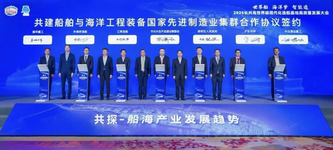 李毅、吴召忠、吕晨飞、蒲亚鹏、陈刚见证,蔡潇飞、徐慧泉以及江南造船、沪东中华、外高桥造船、中远海运重工、振华重工企业负责人签署“共建船舶与海洋工程装备国家先进制造业集群合作协议”,将聚力推动政府、企业、科研机构深度融合,共同推动长兴岛加快实现从“产业集聚”到“集群跃升”的跨越式发展。