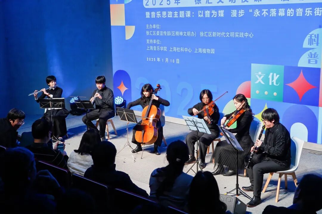 随着欢快的弦乐三重奏响起,音乐思政的年度首课《以音为媒 “漫步永不落幕的音乐街区”》开启了2025年“文明夜课”的序幕。来自上海音乐学院的肖阳在音乐声中讲述音乐与街区的故事,上音的学子也来到现场,为徐汇市民带来了民乐重奏《喜洋洋》《金蛇狂舞》。作为首批夜课的主讲人,肖阳表示,音乐思政的“文明夜课”,不仅是让市民了解到音乐创作背后的故事,更通过现场演奏教学的方式,让市民们享受到听觉盛宴。
