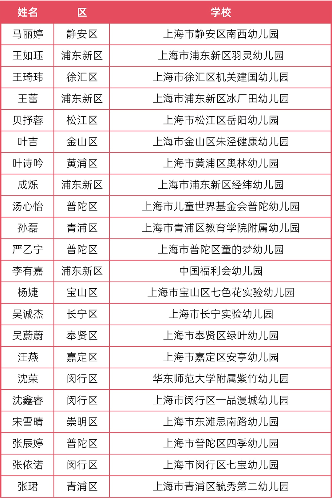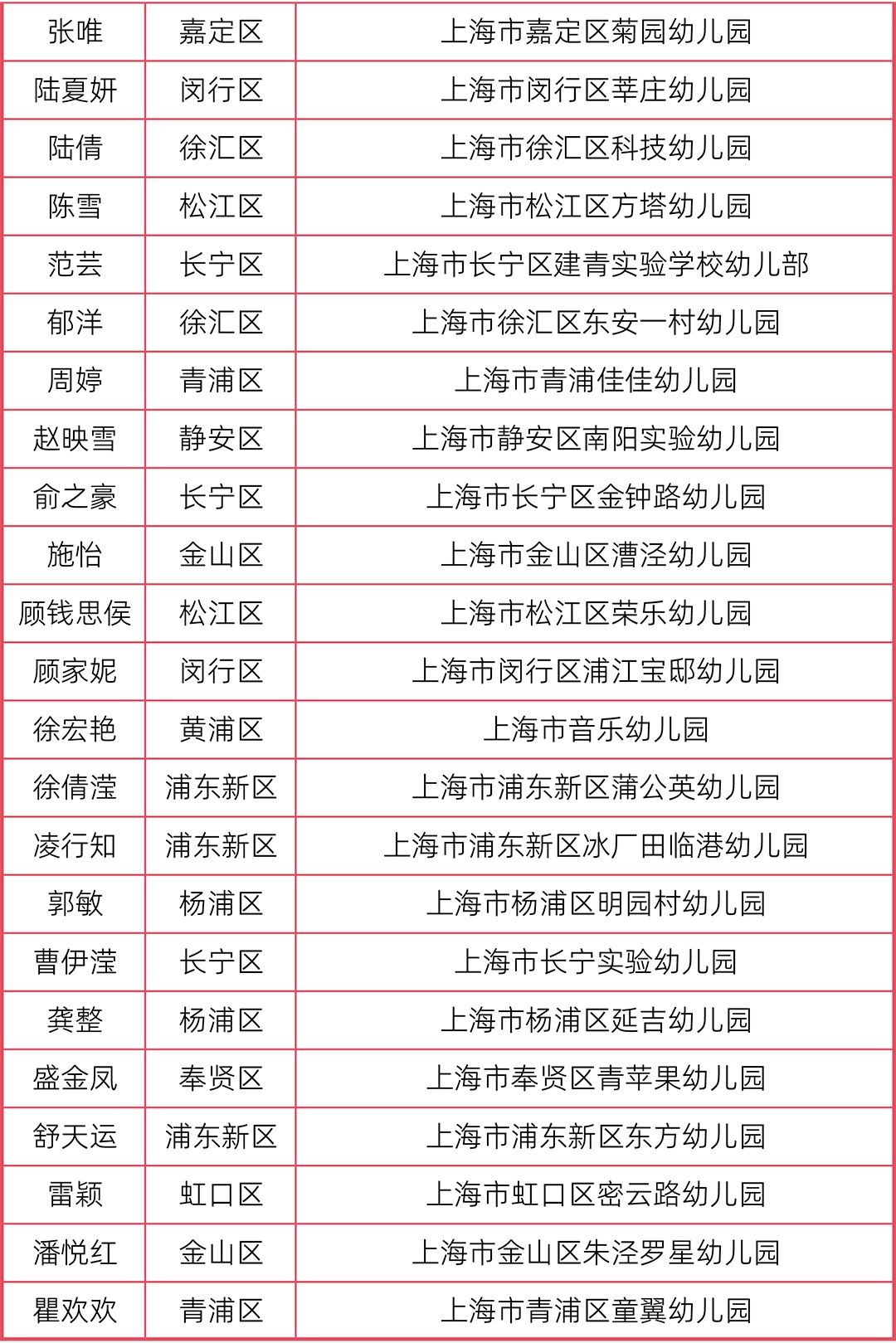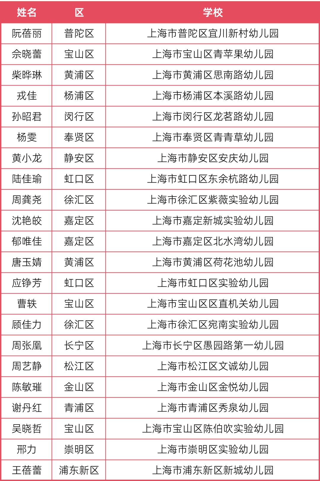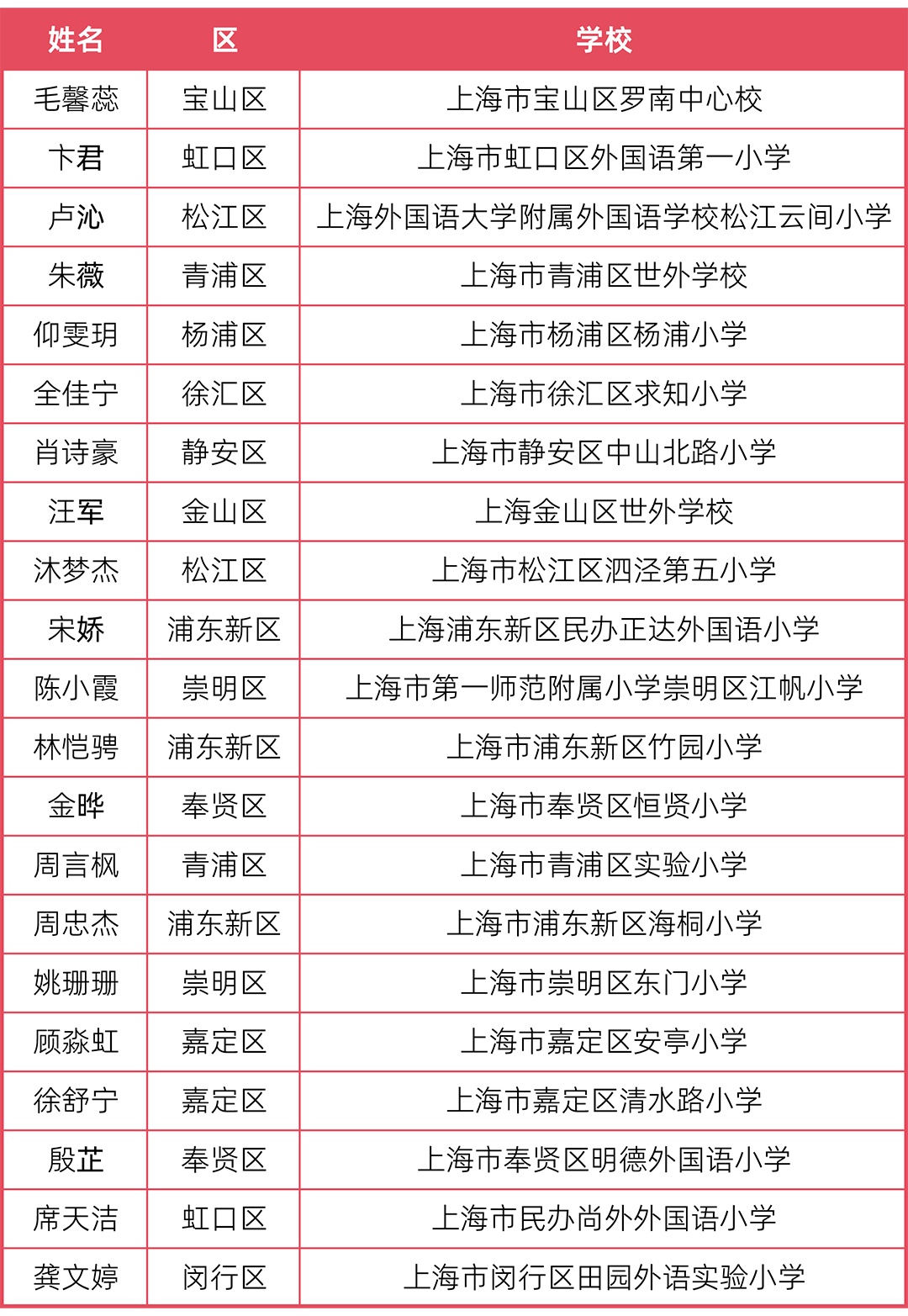 “上海市基础教育中青年教师教学比赛”始于1985年,被誉为上海基础教育界的“奥运会”,各学科每四年轮转一次,对学科教学的影响深远,已成为展示中青年教师教学水平的品牌项目,对提升教师教学能力发挥了直接且显著的作用。2025年教学比赛是第八轮的第四年,参赛学科(学段)包括小学英语、初中英语、高中英语、小学体育与健康、初中体育与健康、高中体育与健康、幼儿教育7个学科/学段。 2025年上海市基础教育(幼儿园)中青年教师教学比赛 获 奖 名 单 小学英语 一等奖 9人 二等奖 21人 (以姓氏笔画为序) 三等奖 7人 (以姓氏笔画为序) 初中英语 一等奖 9人 二等奖 20人 (以姓氏笔画为序) 三等奖 7人 (以姓氏笔画为序) 高中英语 一等奖 8人 二等奖 18人 (以姓氏笔画为序) 三等奖 7人 (以姓氏笔画为序) 小学体育与健康 一等奖 9人 二等奖 18人 (以姓氏笔画为序) 三等奖 7人 (以姓氏笔画为序) 初中体育与健康 一等奖 9人 二等奖 18人 (以姓氏笔画为序) 三等奖 7人 (以姓氏笔画为序) 高中体育与健康 一等奖 9人 二等奖 18人 (以姓氏笔画为序) 三等奖 7人 (以姓氏笔画为序) 幼儿教育 一等奖 22人 二等奖 45人 (以姓氏笔画为序) 三等奖 18人 (以姓氏笔画为序) 如对公示结果有异议,请于2025年12月2日(星期二)至12月8日(星期一)期间,以书面形式向工作组提出,并署真实姓名。 联系地址:上海市静安区陕西北路500号2607室; 邮编:200041; 传真:(021-)62179565。