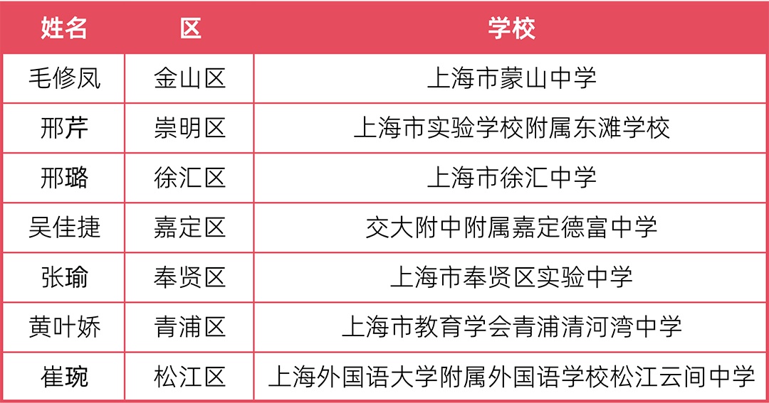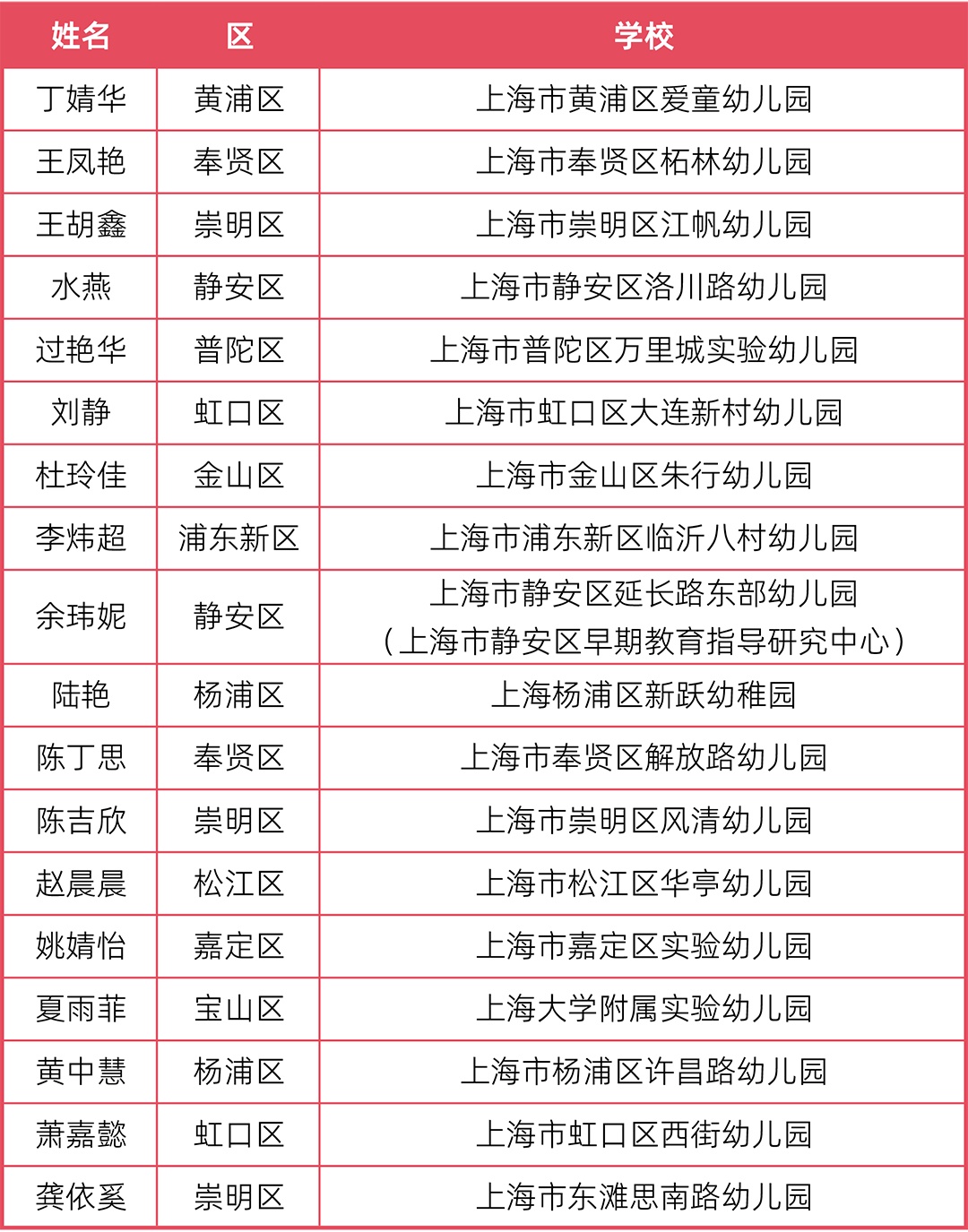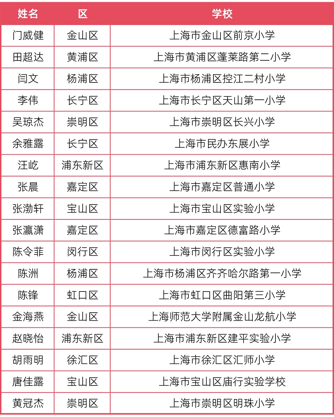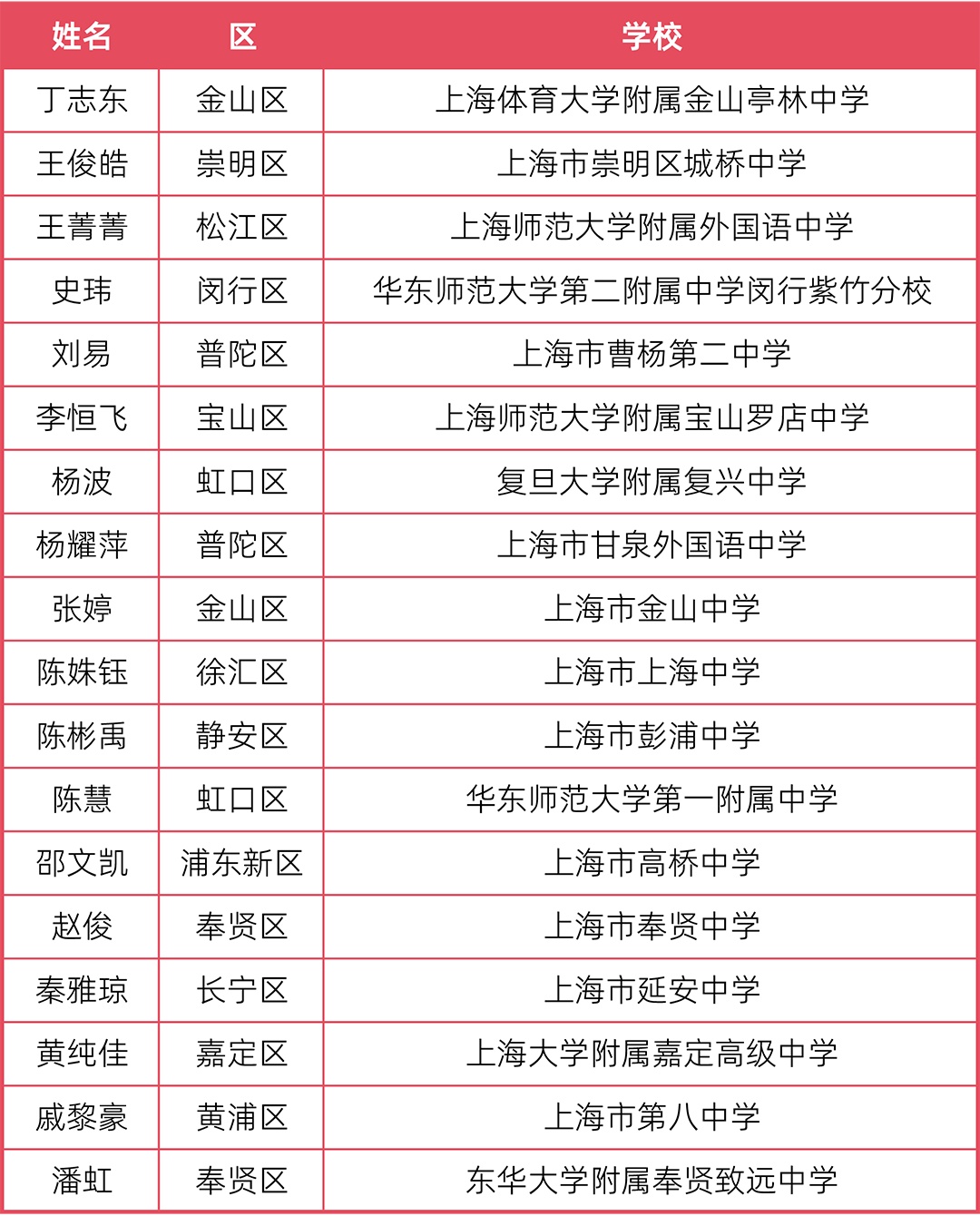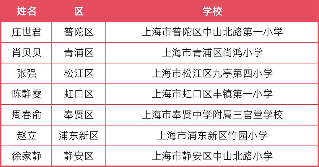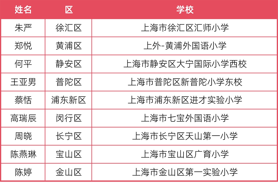 “上海市基础教育中青年教师教学比赛”始于1985年,被誉为上海基础教育界的“奥运会”,各学科每四年轮转一次,对学科教学的影响深远,已成为展示中青年教师教学水平的品牌项目,对提升教师教学能力发挥了直接且显著的作用。2025年教学比赛是第八轮的第四年,参赛学科(学段)包括小学英语、初中英语、高中英语、小学体育与健康、初中体育与健康、高中体育与健康、幼儿教育7个学科/学段。 2025年上海市基础教育(幼儿园)中青年教师教学比赛 获 奖 名 单 小学英语 一等奖 9人 二等奖 21人 (以姓氏笔画为序) 三等奖 7人 (以姓氏笔画为序) 初中英语 一等奖 9人 二等奖 20人 (以姓氏笔画为序) 三等奖 7人 (以姓氏笔画为序) 高中英语 一等奖 8人 二等奖 18人 (以姓氏笔画为序) 三等奖 7人 (以姓氏笔画为序) 小学体育与健康 一等奖 9人 二等奖 18人 (以姓氏笔画为序) 三等奖 7人 (以姓氏笔画为序) 初中体育与健康 一等奖 9人 二等奖 18人 (以姓氏笔画为序) 三等奖 7人 (以姓氏笔画为序) 高中体育与健康 一等奖 9人 二等奖 18人 (以姓氏笔画为序) 三等奖 7人 (以姓氏笔画为序) 幼儿教育 一等奖 22人 二等奖 45人 (以姓氏笔画为序) 三等奖 18人 (以姓氏笔画为序) 如对公示结果有异议,请于2025年12月2日(星期二)至12月8日(星期一)期间,以书面形式向工作组提出,并署真实姓名。 联系地址:上海市静安区陕西北路500号2607室; 邮编:200041; 传真:(021-)62179565。