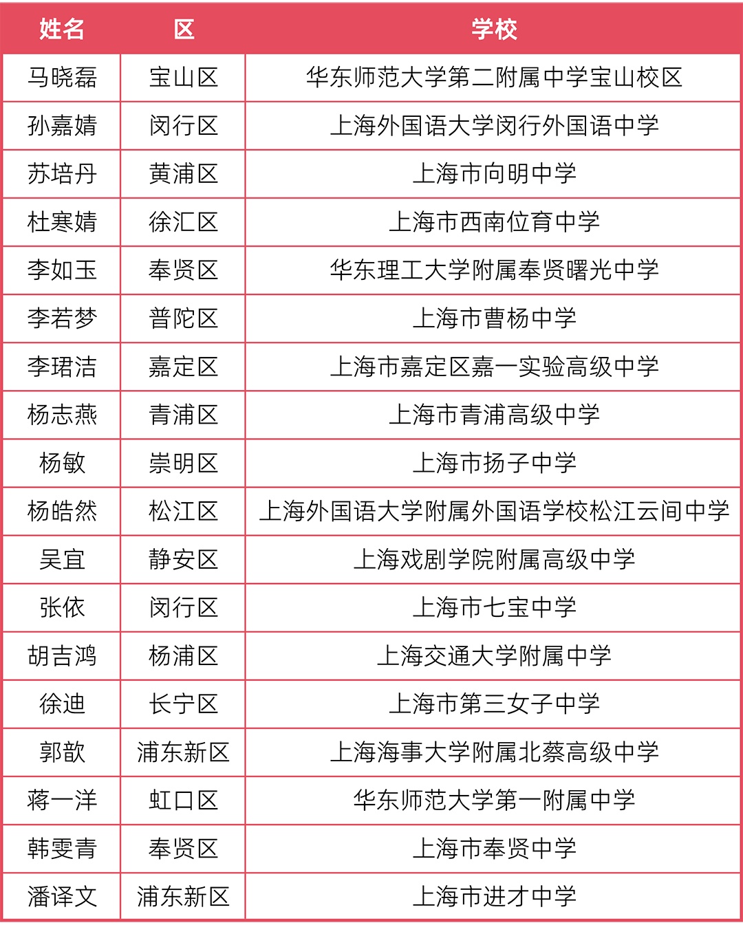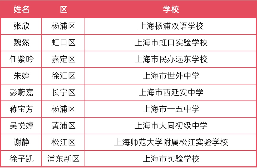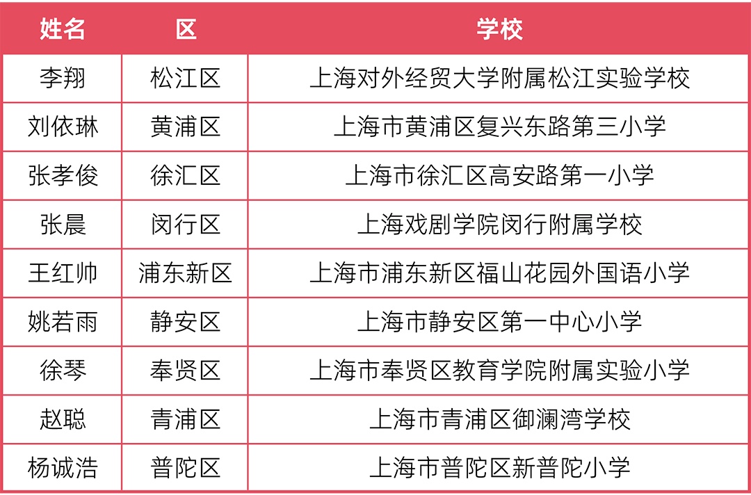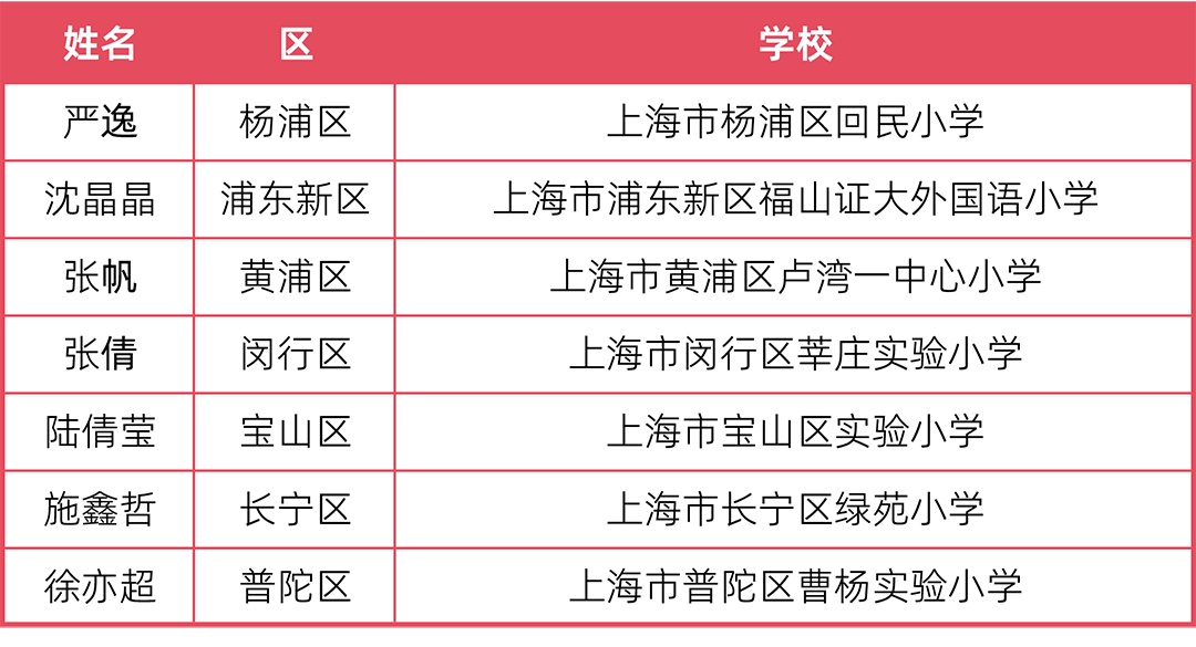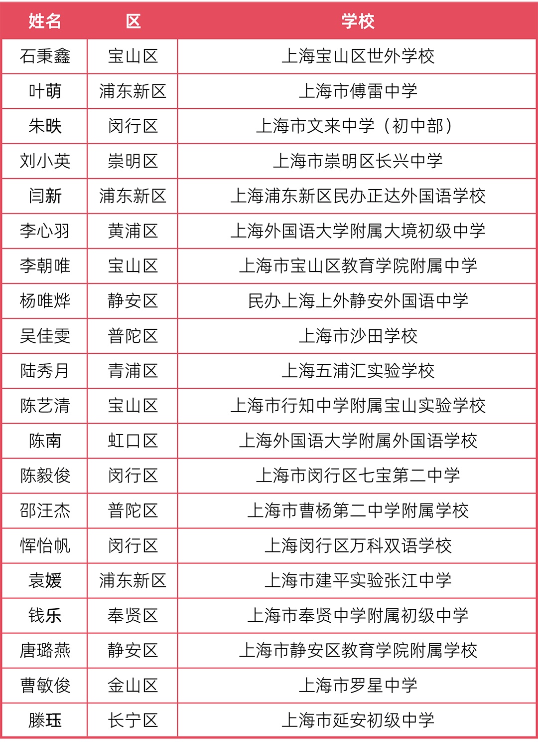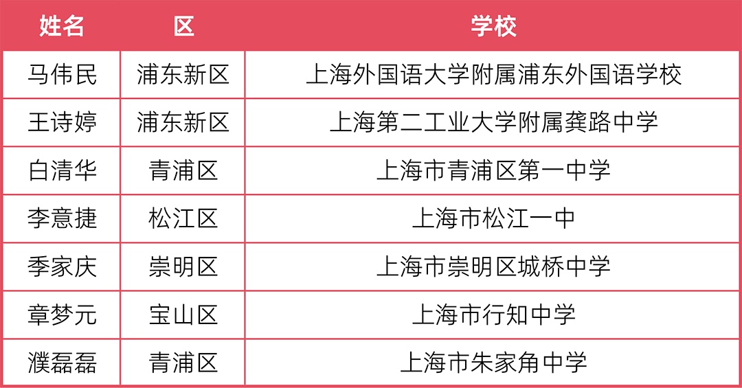 “上海市基础教育中青年教师教学比赛”始于1985年,被誉为上海基础教育界的“奥运会”,各学科每四年轮转一次,对学科教学的影响深远,已成为展示中青年教师教学水平的品牌项目,对提升教师教学能力发挥了直接且显著的作用。2025年教学比赛是第八轮的第四年,参赛学科(学段)包括小学英语、初中英语、高中英语、小学体育与健康、初中体育与健康、高中体育与健康、幼儿教育7个学科/学段。 2025年上海市基础教育(幼儿园)中青年教师教学比赛 获 奖 名 单 小学英语 一等奖 9人 二等奖 21人 (以姓氏笔画为序) 三等奖 7人 (以姓氏笔画为序) 初中英语 一等奖 9人 二等奖 20人 (以姓氏笔画为序) 三等奖 7人 (以姓氏笔画为序) 高中英语 一等奖 8人 二等奖 18人 (以姓氏笔画为序) 三等奖 7人 (以姓氏笔画为序) 小学体育与健康 一等奖 9人 二等奖 18人 (以姓氏笔画为序) 三等奖 7人 (以姓氏笔画为序) 初中体育与健康 一等奖 9人 二等奖 18人 (以姓氏笔画为序) 三等奖 7人 (以姓氏笔画为序) 高中体育与健康 一等奖 9人 二等奖 18人 (以姓氏笔画为序) 三等奖 7人 (以姓氏笔画为序) 幼儿教育 一等奖 22人 二等奖 45人 (以姓氏笔画为序) 三等奖 18人 (以姓氏笔画为序) 如对公示结果有异议,请于2025年12月2日(星期二)至12月8日(星期一)期间,以书面形式向工作组提出,并署真实姓名。 联系地址:上海市静安区陕西北路500号2607室; 邮编:200041; 传真:(021-)62179565。